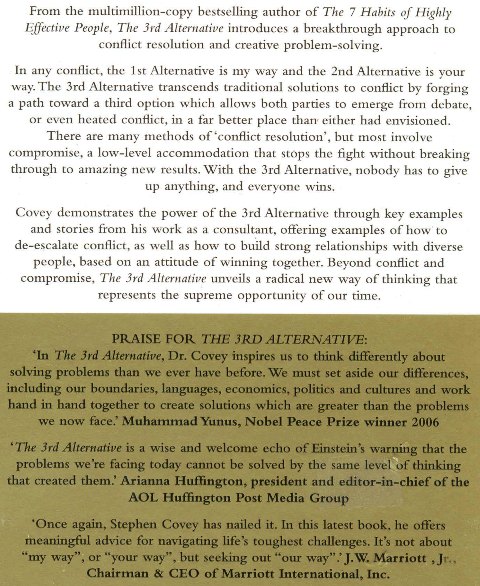 From the multimillion-copy bestselling author of The 7 Habits of Highly Effective People—hailed as the #1 Most Influential Business Book of the Twentieth Century—The 3rd Alternative introduces a breakthrough approach to conflict resolution and creative problem solving. One of Time magazine’s 25 most influential Americans, Dr. Stephen R. Covey has helped millions transform their lives. In The 3rd Alternative, Covey turns his formidable insight to a powerful new way to resolve professional and personal difficulties and create solutions to great challenges in organizations and society. In any conflict, the 1st Alternative is my way and the 2nd Alternative is your way. The fight usually boils down to a question of whose way is better. There are many methods of “conflict resolution,” but most involve compromise, a low-level accommodation that stops the fight without breaking through to amazing new results. The 3rd Alternative is about more than just an armistice—it’s about creating a new and improved reality. A departure from the usual approaches to conflict resolution, negotiation, and innovation, this book reveals a new way of thinking that will be embraced not only by the many fans who have flocked to Covey’s prior books, but also by anyone who is seeking solutions in their professional or personal lives. The 3rd Alternative transcends traditional solutions to conflict by forging a path toward a third option, a 3rd Alternative that moves beyond your way or my way to a higher and better way—one that allows both parties to emerge from debate or even heated conflict in a far better place than either had envisioned. With the 3rd Alternative, nobody has to give up anything, and everyone wins. To a world of escalating strife and contention, 3rd Alternative thinkers like those Covey profiles here bring creative solutions, peace, and healing. Through key examples and stories from his work as a consultant, Covey demonstrates the power of 3rd Alternative thinking. His wide-ranging examples include: a Canadian metropolitan police force that transformed a crime-plagued community by abandoning their “them vs. us” mentality and changing the whole definition of police work; a father who rescued his troubled daughter from years of despair and near suicide in one surprising evening; a judge who brought a quick, peaceful end to one of the biggest environmental lawsuits in American history without setting foot in a courtroom; the principal of a high school for the children of migrant workers who raised their graduation rate from a dismal 30 percent to 90 percent and tripled their basic skill levels; a handful of little-known people who are quietly finding new ways to bring peace to the Middle East; and many others. These various groups and individuals offer living examples of how to create new and better results instead of escalating conflict, as well as how to build strong relationships with diverse people based on an attitude of winning together. Beyond conflict and compromise, The 3rd Alternative unveils a radical, creative new way of thinking. It is a groundbreaking but practical work that demonstrates why 3rd Alternative thinking represents the supreme opportunity of our time.