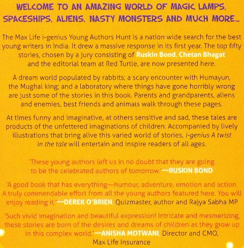 Welcome to an amazing world of magic lamps, talking squirrels, nasty monsters and much more. The Max Life i-genius Young Authors Hunt is a nation-wide search for the best young writers in India. It drew a massive response in its first year. The top fifty stories, chosen by a jury consisting of Ruskin Bond, Chetan Bhagat and the editorial team at Red Turtle are now presented here. A dream world populated by rabbits, a scary encounter with Humayun the Mughal king, a laboratory where things have gone horribly wrong, are just some of the stories in this book. Parents and grandparents, aliens and enemies, best friends and animals walk through these pages. At times funny and imaginative, at others sensitive and sad, these tales are products of the unfettered imaginations of children. Accompanied by lively illustrations that bring alive this varied world of stories, i-genius A Twist in the Tale will entertain and inspire readers of all ages.