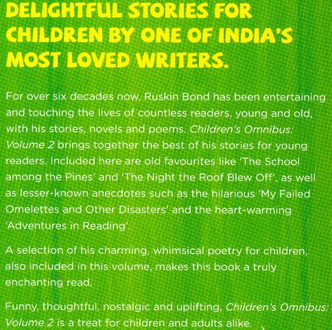 Delightful stories for children by one of Indias most loved writers. For over six decades now, Ruskin Bond has been entertaining and touching the lives of countless readers, young and old, with his stories, novels and poems. Childrens Omnibus: Volume 2 brings together the best of his stories for young readers. Included here are old favourites like The School among the Pines and The Night the Roof Blew Off, as well as lesser known anecdotes such as the hilarious My Failed Omelettes and Other Disasters and the heart warming Adventures in Reading. A selection of his charming, whimsical poetry for children, also included in this volume, makes this book a truly enchanting read. Funny, thoughtful, nostalgic and uplifting, Childrens Omnibus: Volume 2 is a treat for children and adults alike.