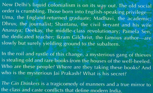 New Delhi's liquid colonialism is on its way out. The old social order is crumbling. Those born into English-speaking privilege - Uma, the England-returned graduate; Madhavi, the academic, and journalist Dhruv; Shantanu, the civil servant, and his wife Anasuya; Deekay, the middle-class revolutionary; Pamela Sen, the dedicated teacher; Ikram Gilchrist, the famous author - are slowly but surely yielding ground to the subaltern. In the roil and rustle of this change, a mysterious gang of thieves is stealing old and rare books from the houses of the well-heeled. Who are these people? Where are they taking these books? And who is the mysterious Jai Prakash? What is his secret? The Gin Drinkers is a tragicomedy of manners and a true mirror to the class and caste conflicts that define modern India.