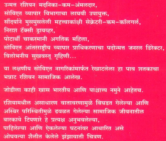 रशियामधील असाधारण वातावरणामुळे बिघडत गेलेल्या आणि अस्थिर परिस्थितीमुळे ढवळत गेलेल्या सामाजिक जीवनातील बारकावे टिपणारे, तसेच प्रत्यक्ष अनुभवलेल्या, पाहिलेल्या आणि ऐकलेल्या घटनांवर आधारित असे ओघवत्या शैलीत केलेले झंझावाती चित्रण.