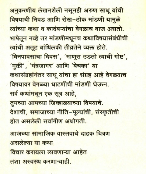 अनुकरणीय लेखनशैली नसूनही अरुण साधू यांची विषयाची निवड आणि रोख-ठोक मांडणी यामुळे त्यांच्या कथा व कादंबऱ्यांचा वेगळाच बाज असतो. भाषेतून नव्हे तर मांडणीमधूनच कथाविषयासंबंधीची त्यांची अतूट बांधिलकी तीव्रतेने व्यक्त होते. ‘बिनपावसाचा दिवस’, ‘माणूस उडतो त्याची गोष्ट’, ‘मुक्ती’, ‘मंत्रजागर’ आणि ‘बेचका’ या कथासंग्रहानंतर साधू यांचा हा संग्रह आहे वेगळ्याच विषयावर वेगळ्या धाटणीची मांडणी घेऊन. सर्व कथांमधून एक सूत्र आहे, तुमच्या आमच्या जिव्हाळ्याच्या विषयाचे. देशाची, समाजाच्या नीति-मूल्यांची, संस्कृतीची होत असलेली सर्वांगीण अधोगती. आजच्या सामाजिक वास्तवाचे दाहक चित्रण असलेल्या या कथा विचार करायला लावणार्या आहेत तशा अस्वस्थ करणार्याही.