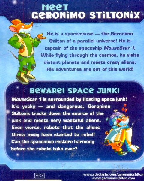 MouseStar 1 is surrounded by floating space junk! It's yucky - and dangerous. It's coming from a nearby planet, Cleanix. Geronimo Stiltonix goes to visit, and discovers that the aliens there are very wasteful. Even worse, robots that they've thrown in the trash have started to rebel! Can the spacemice restore harmony before the robots take over?