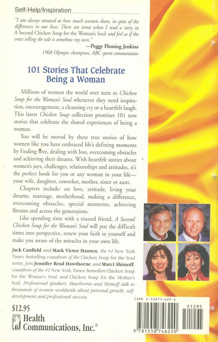 will be moved by these true accounts of how women like you have embraced life's defining moments by finding love, dealing with loss, overcoming obstacles and achieving their dreams and goals. Like spending time with a trusted friend, A Second Chicken Soup for the Woman's Soul will put difficult times into perspective, renew your faith in yourself and make you aware of the miracles in your own life