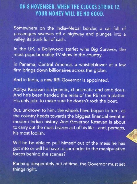 On 8 November, when the clock strikes 8, your money will be no good. Somewhere on the India - Nepal Border, a car full of passengers swerves off a highway and plunges into a valley, its trunk full of cash. In the UK, a Bollywood starlet wins Big Survivor, the most popular reality TV show in the country. In Panama, Central America, a whistle-blower at a law firm brings down billionaires across the globe. And in India, a new RBI Governor is appointed. Aditya Kesavan is dynamic, charismatic and ambitious. And he's been handed the reins of the RBI on a platter. His only job: to make sure he doesn't rock the boat. But, unknown to him, the wheels have begun to turn, as the country heads towards the biggest financial event in modern Indian history. And Governor Kesavan is about to carry out the most brazen act of his life - and, perhaps, his most foolish. Will he be able to pull himself out of the mess he has got into or will he have to surrender to the manipulative forces behind the scenes? Running desperately out of time, the Governor must set things right.