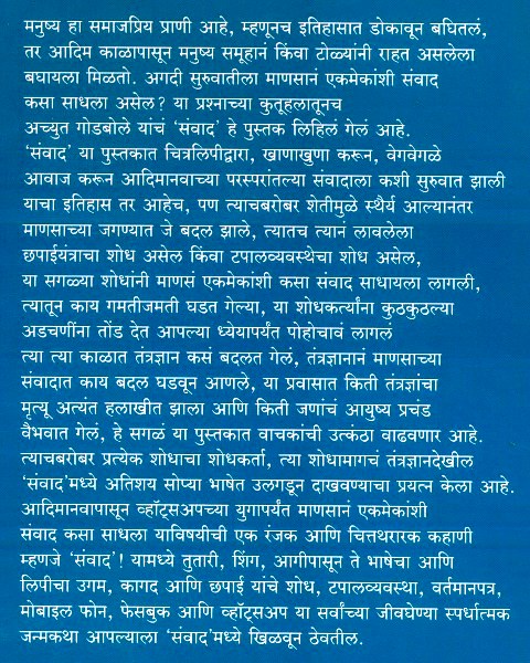 рдордиреБрд╖реНрдп рд╣рд╛ рд╕рдорд╛рдЬрдкреНрд░рд┐рдп рдкреНрд░рд╛рдгреА рдЖрд╣реЗ, рдореНрд╣рдгреВрдирдЪ рдЗрддрд┐рд╣рд╛рд╕рд╛рдд рдбреЛрдХрд╛рд╡реВрди рдмрдШрд┐рддрд▓рдВ, рддрд░ рдЖрджрд┐рдо рдХрд╛рд│рд╛рдкрд╛рд╕реВрди рдордиреБрд╖реНрдп рд╕рдореВрд╣рд╛рдирдВ рдХрд┐рдВрд╡рд╛ рдЯреЛрд│реНрдпрд╛рдВрдиреА рд░рд╛рд╣рдд рдЕрд╕рд▓реЗрд▓рд╛ рдмрдШрд╛рдпрд▓рд╛ рдорд┐рд│рддреЛ. рдЕрдЧрджреА рд╕реБрд░реБрд╡рд╛рддреАрд▓рд╛ рдорд╛рдгрд╕рд╛рдирдВ рдПрдХрдореЗрдХрд╛рдВрд╢реА рд╕рдВрд╡рд╛рдж рдХрд╕рд╛ рд╕рд╛рдзрд▓рд╛ рдЕрд╕реЗрд▓? рдпрд╛ рдкреНрд░рд╢реНтАНрдирд╛рдЪреНрдпрд╛ рдХреБрддреВрд╣рд▓рд╛рддреВрдирдЪ рдЕрдЪреНрдпреБрдд рдЧреЛрдбрдмреЛрд▓реЗ рдпрд╛рдВрдЪрдВ тАШрд╕рдВрд╡рд╛рджтАЩ рд╣реЗ рдкреБрд╕реНрддрдХ рд▓рд┐рд╣рд┐рд▓рдВ рдЧреЗрд▓рдВ рдЖрд╣реЗ. тАШрд╕рдВрд╡рд╛рджтАЩ рдпрд╛ рдкреБрд╕реНрддрдХрд╛рдд рдЪрд┐рддреНрд░рд▓рд┐рдкреАрджреНрд╡рд╛рд░рд╛, рдЦрд╛рдгрд╛рдЦреБрдгрд╛ рдХрд░реВрди, рд╡реЗрдЧрд╡реЗрдЧрд│реЗ рдЖрд╡рд╛рдЬ рдХрд░реВрди рдЖрджрд┐рдорд╛рдирд╡рд╛рдЪреНрдпрд╛ рдкрд░рд╕реНрдкрд░рд╛рдВрддрд▓реНрдпрд╛ рд╕рдВрд╡рд╛рджрд╛рд▓рд╛ рдХрд╢реА рд╕реБрд░реБрд╡рд╛рдд рдЭрд╛рд▓реА рдпрд╛рдЪрд╛ рдЗрддрд┐рд╣рд╛рд╕ рддрд░ рдЖрд╣реЗрдЪ, рдкрдг рддреНрдпрд╛рдЪрдмрд░реЛрдмрд░ рд╢реЗрддреАрдореБрд│реЗ рд╕реНрдереИрд░реНрдп рдЖрд▓реНрдпрд╛рдирдВрддрд░ рдорд╛рдгрд╕рд╛рдЪреНрдпрд╛ рдЬрдЧрдгреНрдпрд╛рдд рдЬреЗ рдмрджрд▓ рдЭрд╛рд▓реЗ, рддреНрдпрд╛рддрдЪ рддреНрдпрд╛рдирдВ рд▓рд╛рд╡рд▓реЗрд▓рд╛ рдЫрдкрд╛рдИрдпрдВрддреНрд░рд╛рдЪрд╛ рд╢реЛрдз рдЕрд╕реЗрд▓ рдХрд┐рдВрд╡рд╛ рдЯрдкрд╛рд▓рд╡реНрдпрд╡рд╕реНрдереЗрдЪрд╛ рд╢реЛрдз рдЕрд╕реЗрд▓, рдпрд╛ рд╕рдЧрд│реНрдпрд╛ рд╢реЛрдзрд╛рдВрдиреА рдорд╛рдгрд╕рдВ рдПрдХрдореЗрдХрд╛рдВрд╢реА рдХрд╕рд╛ рд╕рдВрд╡рд╛рдж рд╕рд╛рдзрд╛рдпрд▓рд╛ рд▓рд╛рдЧрд▓реА, рддреНрдпрд╛рддреВрди рдХрд╛рдп рдЧрдорддреАрдЬрдорддреА рдШрдбрдд рдЧреЗрд▓реНрдпрд╛, рдпрд╛ рд╢реЛрдзрдХрд░реНрддреНрдпрд╛рдВрдирд╛ рдХреБрдардХреБрдард▓реНрдпрд╛ рдЕрдбрдЪрдгреАрдВрдирд╛ рддреЛрдВрдб рджреЗрдд рдЖрдкрд▓реНрдпрд╛ рдзреНрдпреЗрдпрд╛рдкрд░реНрдпрдВрдд рдкреЛрд╣реЛрдЪрд╛рд╡рдВ рд▓рд╛рдЧрд▓рдВ, рддреНрдпрд╛ рддреНрдпрд╛ рдХрд╛рд│рд╛рдд рддрдВрддреНрд░рдЬреНрдЮрд╛рди рдХрд╕рдВ рдмрджрд▓рдд рдЧреЗрд▓рдВ, рддрдВрддреНрд░рдЬреНрдЮрд╛рдирд╛рдирдВ рдорд╛рдгрд╕рд╛рдЪреНрдпрд╛ рд╕рдВрд╡рд╛рджрд╛рдд рдХрд╛рдп рдмрджрд▓ рдШрдбрд╡реВрди рдЖрдгрд▓реЗ, рдпрд╛ рдкреНрд░рд╡рд╛рд╕рд╛рдд рдХрд┐рддреА рддрдВрддреНрд░рдЬреНрдЮрд╛рдВрдЪрд╛ рдореГрддреНрдпреВ рдЕрддреНрдпрдВрдд рд╣рд▓рд╛рдЦреАрдд рдЭрд╛рд▓рд╛ рдЖрдгрд┐ рдХрд┐рддреА рдЬрдгрд╛рдВрдЪрдВ рдЖрдпреБрд╖реНрдп рдкреНрд░рдЪрдВрдб рд╡реИрднрд╡рд╛рдд рдЧреЗрд▓рдВ, рд╣реЗ рд╕рдЧрд│рдВ рдпрд╛ рдкреБрд╕реНрддрдХрд╛рдд рд╡рд╛рдЪрдХрд╛рдВрдЪреА рдЙрддреНрдХрдВрдард╛ рд╡рд╛рдврд╡рдгрд╛рд░ рдЖрд╣реЗ. рддреНрдпрд╛рдЪрдмрд░реЛрдмрд░ рдкреНрд░рддреНрдпреЗрдХ рд╢реЛрдзрд╛рдЪрд╛ рд╢реЛрдзрдХрд░реНрддрд╛, рддреНрдпрд╛ рд╢реЛрдзрд╛рдорд╛рдЧрдЪрдВ рддрдВрддреНрд░рдЬреНрдЮрд╛рдирджреЗрдЦреАрд▓ тАШрд╕рдВрд╡рд╛рджтАЩрдордзреНрдпреЗ рдЕрддрд┐рд╢рдп рд╕реЛрдкреНрдпрд╛ рднрд╛