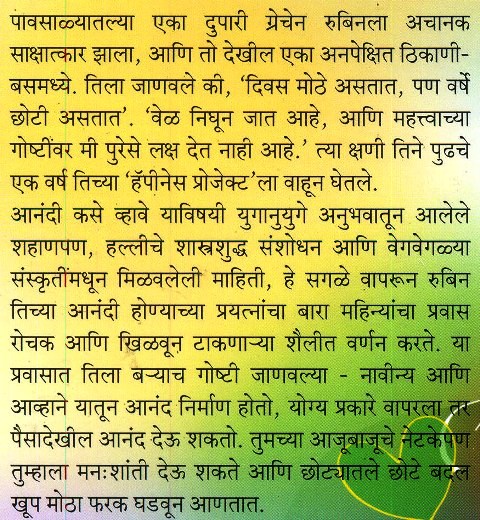 рдкрд╛рд╡рд╕рд╛рд│реНрдпрд╛рддрд▓реНрдпрд╛ рдПрдХрд╛ рджреБрдкрд╛рд░реА рдЧреНрд░реЗрдЪреЗрди рд░реБрдмрд┐рдирд▓рд╛ рдЕрдЪрд╛рдирдХ рд╕рд╛рдХреНрд╖рд╛рддреНрдХрд╛рд░ рдЭрд╛рд▓рд╛, рдЖрдгрд┐ рддреЛ рджреЗрдЦреАрд▓ рдПрдХрд╛ рдЕрдирдкреЗрдХреНрд╖рд┐рдд рдард┐рдХрд╛рдгреА тАУ рдмрд╕рдордзреНрдпреЗ. рддрд┐рд▓рд╛ рдЬрд╛рдгрд╡рд▓реЗ рдХреА, тАЬрджрд┐рд╡рд╕ рдореЛрдареЗ рдЕрд╕рддрд╛рдд, рдкрдг рд╡рд░реНрд╖реЗ рдЫреЛрдЯреА рдЕрд╕рддрд╛рддтАЭ. тАЬрд╡реЗрд│ рдирд┐рдШреВрди рдЬрд╛рдд рдЖрд╣реЗ, рдЖрдгрд┐ рдорд╣рддреНрд╡рд╛рдЪреНрдпрд╛ рдЧреЛрд╖реНрдЯреАрдВрд╡рд░ рдореА рдкреБрд░реЗрд╕реЗ рд▓рдХреНрд╖ рджреЗрдд рдирд╛рд╣реА рдЖрд╣реЗ.тАЭ рддреНрдпрд╛рдХреНрд╖рдгреА рддрд┐рдиреЗ рдкреБрдврдЪреЗ рдПрдХ рд╡рд░реНрд╖ рддрд┐рдЪреНрдпрд╛ тАШрд╣реЕрдкреАрдиреЗрд╕ рдкреНрд░реЛрдЬреЗрдХреНрдЯтАЩрд▓рд╛ рд╡рд╛рд╣реВрди рдШреЗрддрд▓реЗ. рдЖрдирдВрджреА рдХрд╕реЗ рд╡реНрд╣рд╛рд╡реЗ рдпрд╛ рд╡рд┐рд╖рдпреА рдпреБрдЧрд╛рдирдпреБрдЧреЗ рдЕрдиреБрднрд╡рд╛рддреВрди рдЖрд▓реЗрд▓реЗ рд╢рд╣рд╛рдгрдкрдг, рд╣рд▓реНрд▓реАрдЪреЗ рд╢рд╛рд╕реНрддреНрд░рд╢реБрджреНрдз рд╕рдВрд╢реЛрдзрди рдЖрдгрд┐ рд╡реЗрдЧрд╡реЗрдЧрд│реНрдпрд╛ рд╕рдВрд╕реНрдХреГрддреАрдордзреВрди рдорд┐рд│рд╡рд▓реЗрд▓реА рдорд╛рд╣рд┐рддреА, рд╣реЗ рд╕рдЧрд│реЗ рд╡рд╛рдкрд░реВрди рд░реБрдмрд┐рди рддрд┐рдЪреНрдпрд╛ рдЖрдирдВрджреА рд╣реЛрдгреНрдпрд╛рдЪреНрдпрд╛ рдкреНрд░рдпрддреНрдирд╛рдВрдЪрд╛ рдмрд╛рд░рд╛ рдорд╣рд┐рдиреНрдпрд╛рдЪрд╛ рдкреНрд░рд╡рд╛рд╕ рддрд┐рдЪреНрдпрд╛ рд░реЛрдЪрдХ рдЖрдгрд┐ рдЦрд┐рд│рд╡реВрди рдЯрд╛рдХрдгрд╛рд▒реНрдпрд╛ рд╢реИрд▓реАрдд рд╡рд░реНрдгрди рдХрд░рддреЗ. рдпрд╛ рдкреНрд░рд╡рд╛рд╕рд╛рдд рддрд┐рд▓рд╛ рдмрд▒реНрдпрд╛рдЪ рдЧреЛрд╖реНрдЯреА рдЬрд╛рдгрд╡рд▓реНрдпрд╛ тАУ рдирд╛рд╡рд┐рдиреНрдп рдЖрдгрд┐ рдЖрд╡реНрд╣рд╛рдиреЗ рдпрд╛рддреВрди рдЖрдирдВрдж рдирд┐рд░реНрдорд╛рдг рд╣реЛрддреЛ, рдпреЛрдЧреНрдп рдкреНрд░рдХрд╛рд░реЗ рд╡рд╛рдкрд░рд▓рд╛ рддрд░ рдкреИрд╕рд╛рджреЗрдЦреАрд▓ рдЖрдирдВрдж рджреЗрдК рд╢рдХрддреЛ, рддреБрдордЪреНрдпрд╛ рдЖрдЬреВрдмрд╛рдЬреВрдЪреЗ рдиреЗрдЯрдХреЗрдкрдг рддреБрдореНрд╣рд╛рд▓рд╛ рдордирдГрд╢рд╛рдВрддреА рджреЗрдК рд╢рдХрддреЗ рдЖрдгрд┐ рдЫреЛрдЯреНрдпрд╛рддрд▓реЗ рдЫреЛрдЯреЗ рдмрджрд▓ рдЦреВрдк рдореЛрдард╛ рдлрд░рдХ рдШрдбрд╡реВрди рдЖрдгрддрд╛рдд.