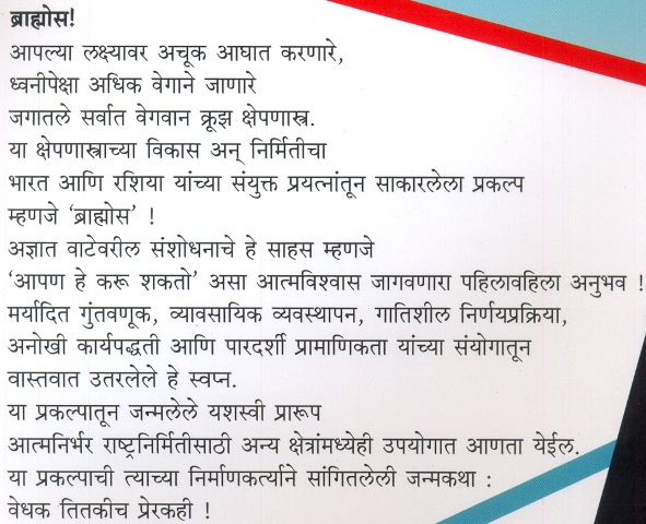 ब्राह्मोस! आपल्या लक्ष्यावर अचूक आघात करणारे, ध्वनीपेक्षा अधिक वेगाने जाणारे जगातले सर्वात वेगवान क्रूझ क्षेपणास्त्र. या क्षेपणास्त्राच्या विकास आणि निर्मितीचा भारत आणि रशिया यांच्या संयुक्त प्रयत्नांतून साकारलेला प्रकल्प म्हणजे ‘ब्राह्मोस’! अज्ञात वाटेवरील संशोधनाचे हे साहस म्हणजे ‘आपण हे करू शकतो’ असा आत्मविश्वास जागवणारा पहिलावहिला अनुभव! मर्यादित गुंतवणूक, व्यावसायिक व्यवस्थापन, गतिशील निर्णयप्रक्रिया, अनोखी कार्यपद्धती आणि पारदर्शी प्रामाणिकता यांच्या संयोगातून वास्तवात उतरलेले हे स्वप्न. या प्रकल्पातून जन्मलेले यशस्वी प्रारूप आत्मनिर्भर राष्ट्रनिर्मितीसाठी अन्य क्षेत्रांमध्येही उपयोगात आणता येईल. या प्रकल्पाची त्याच्या निर्माणकर्त्याने सांगितलेली जन्मकथा: वेधक तितकीच प्रेरकही!
