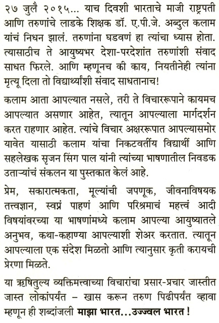 реирен рдЬреБрд▓реИ реирежрезрел... рдпрд╛рдЪ рджрд┐рд╡рд╢реА рднрд╛рд░рддрд╛рдЪреЗ рдорд╛рдЬреА рд░рд╛рд╖реНрдЯреНрд░рдкрддреА рдЖрдгрд┐ рддрд░реБрдгрд╛рдВрдЪреЗ рд▓рд╛рдбрдХреЗ рд╢рд┐рдХреНрд╖рдХ рдбреЙ. рдП.рдкреА.рдЬреЗ. рдЕрдмреНрджреБрд▓ рдХрд▓рд╛рдо рдпрд╛рдВрдЪрдВ рдирд┐рдзрди рдЭрд╛рд▓рдВ. рддрд░реБрдгрд╛рдВрдирд╛ рдШрдбрд╡рдгрдВ рд╣рд╛ рддреНрдпрд╛рдВрдЪрд╛ рдзреНрдпрд╛рд╕ рд╣реЛрддрд╛. рддреНрдпрд╛рд╕рд╛рдареАрдЪ рддреЗ рдЖрдпреБрд╖реНрдпрднрд░ рджреЗрд╢рд╛-рдкрд░рджреЗрд╢рд╛рдВрдд рддрд░реБрдгрд╛рдВрд╢реА рд╕рдВрд╡рд╛рдж рд╕рд╛рдзрдд рдлрд┐рд░рд▓реЗ. рдЖрдгрд┐ рдореНрд╣рдгреВрдирдЪ рдХреА рдХрд╛рдп, рдирд┐рдпрддреАрдиреЗрд╣реА рддреНрдпрд╛рдВрдирд╛ рдореГрддреНрдпреВ рджрд┐рд▓рд╛ рддреЛ рд╡рд┐рджреНрдпрд╛рд░реНрдереНрдпрд╛рдВрд╢реА рд╕рдВрд╡рд╛рдж рд╕рд╛рдзрддрд╛рдирд╛рдЪ! рдХрд▓рд╛рдо рдЖрддрд╛ рдЖрдкрд▓реНрдпрд╛рдд рдирд╕рд▓реЗ, рддрд░реА рддреЗ рд╡рд┐рдЪрд╛рд░рд░реВрдкрд╛рдиреЗ рдХрд╛рдпрдордЪ рдЖрдкрд▓реНрдпрд╛рдд рдЕрд╕рдгрд╛рд░ рдЖрд╣реЗрдд, рддреНрдпрд╛рддреВрди рдЖрдкрд▓реНрдпрд╛рд▓рд╛ рдорд╛рд░реНрдЧрджрд░реНрд╢рди рдХрд░рдд рд░рд╛рд╣рдгрд╛рд░ рдЖрд╣реЗрдд. рддреНрдпрд╛рдВрдЪреЗ рд╡рд┐рдЪрд╛рд░ рдЕрдХреНрд╖рд░рд░реВрдкрд╛рдд рдЖрдкрд▓реНрдпрд╛рд╕рдореЛрд░ рдпрд╛рд╡реЗрдд рдпрд╛рд╕рд╛рдареА рдХрд▓рд╛рдо рдпрд╛рдВрдЪрд╛ рдирд┐рдХрдЯрд╡рд░реНрддреАрдп рд╡рд┐рджреНрдпрд╛рд░реНрдереА рдЖрдгрд┐ рд╕рд╣рд▓реЗрдЦрдХ рд╕реГрдЬрди рд╕рд┐рдВрдЧ рдкрд╛рд▓ рдпрд╛рдВрдиреА рддреНрдпрд╛рдВрдЪреНрдпрд╛ рднрд╛рд╖рдгрд╛рддреАрд▓ рдирд┐рд╡рдбрдХ рдЙрддрд╛рд░реНтАНрдпрд╛рдВрдЪрдВ рд╕рдВрдХрд▓рди рдпрд╛ рдкреБрд╕реНрддрдХрд╛рдд рдХреЗрд▓рдВ рдЖрд╣реЗ. рдкреНрд░реЗрдо, рд╕рдХрд╛рд░рд╛рддреНрдордХрддрд╛, рдореВрд▓реНрдпрд╛рдВрдЪреА рдЬрдкрдгреВрдХ, рдЬреАрд╡рдирд╛рд╡рд┐рд╖рдпрдХ рддрддреНрддреНрд╡рдЬреНрдЮрд╛рди, рд╕реНрд╡рдкреНрдирдВ рдкрд╛рд╣рдгрдВ рдЖрдгрд┐ рдкрд░рд┐рд╢реНрд░рдорд╛рдЪрдВ рдорд╣рддреНрддреНрд╡рдВ рдЖрджреА рд╡рд┐рд╖рдпрд╛рдВрд╡рд░рдЪреНрдпрд╛ рдпрд╛ рднрд╛рд╖рдгрд╛рдВрдордзреНрдпреЗ рдХрд▓рд╛рдо рдЖрдкрд▓реНрдпрд╛ рдЖрдпреБрд╖реНрдпрд╛рддрд▓реЗ рдЕрдиреБрднрд╡, рдХрдерд╛-рдХрд╣рд╛рдгреНрдпрд╛ рдЖрдкрд▓реНрдпрд╛рд╢реА рд╢реЗрдЕрд░ рдХрд░рддрд╛рдд. рддреНрдпрд╛рддреВрди рдЖрдкрд▓реНрдпрд╛рд▓рд╛ рдПрдХ рд╕рдВрджреЗрд╢ рдорд┐рд│рддреЛ рдЖрдгрд┐ рддреНрдпрд╛рдиреБрд╕рд╛рд░ рдХреГрддреА рдХрд░рд╛рдпрдЪреА рдкреНрд░реЗрд░рдгрд╛ рдорд┐рд│рддреЗ. рдпрд╛ рдЛрд╖рд┐рддреБрд▓реНрдп рд╡реНрдпрдХреНрддрд┐рдорддреНрддреНрд╡рд╛рдЪреНрдпрд╛ рд╡рд┐рдЪрд╛рд░рд╛рдВрдЪрд╛ рдкреНрд░рд╕рд╛рд░-рдкреНрд░рдЪрд╛рд░ рдЬрд╛рд╕реНрддреАрдд рдЬрд╛рд╕реНрдд рд▓реЛрдХрд╛рдВрдкрд░реНрдпрдВрдд тАУ рдЦрд╛рд╕ рдХрд░реВрди рддрд░реБрдг рдкрд┐рдвреАрдкрд░реНрдпрдВрдд рд╡реНрд╣рд╛рд╡рд╛ рдореНрд╣рдгреВрди рд╣реА рд╢рдмреНрджрд╛рдВрдЬрд▓реА рдорд╛рдЭрд╛ рднрд╛рд░рдд...рдЙрдЬреНрдЬреНрд╡рд▓ рднрд╛рд░рдд !