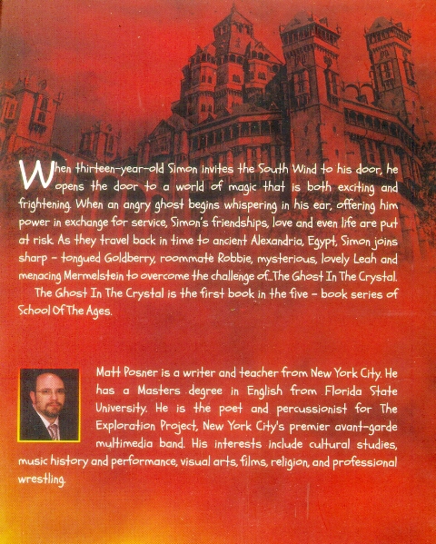 About the Book: Ghost in the Crystal When thirteen-year-old Simon invites the South Wind to his door, he opens the door to a world of magic that is both exciting and frightening. When an angry ghost begins whispering in his ear, offering him power in exchange for service, Simon's friendships, love and even life are put at risk. As they travel back in time to ancient Alexandria, Egypt, Simon joins sharp - tongued Goldberry, roommate Robbie, mysterious, lovely Leah and menacing Mermelstein to overcome the challenge of...The Ghost In The Crystal. The Ghost In The Crystal is the first book in the five-book series of School Of The Ages. About the Author: Matt Posner Matt Posner is a writer and teacher from New York City. He has a Masters degree in English from Florida State University. He is the poet and percussionist for The Exploration Project, New York City's premier avant-garde multimedia band. His interests include cultural studies, music history and performance, visual arts, films, religion, and professional wrestling