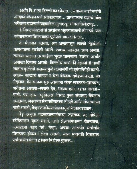 अधीर नि आतूर दिल्ली का छोकरा...वयाला न शोभणारी आव्हानं बेधडकपणॆ स्वीकारणारा...प्रारंभालाच यशाचं मांद्य शरीरावर चढल्याने बहकलेला गुलछबू-गोबरा क्रिकेटपटू...ही विराट कोहलीची अर्थातच भूतकाळाची तीन रुपं. पण वर्तमानातला विराट याहून पूर्णपणे आगळावेगळा... डू अचूक तडकावल्यानंतरचा टणत्कार दर खेपेला स्टेडियमभर घुमत राहतो, तशी प्रेक्षकांमधल्या चैतन्याला, उत्साहाला बहार येते. तेव्हा, अवघा आसमंत सर्वार्थानं विराटमय होऊन गेलेला असतो. याच सहस्त्रकी विराटमय पर्वाचा वेध घेणारं हे रंजक नि प्रेरक पुस्तक....