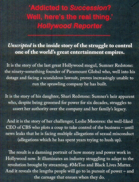 Unscripted is the inside story of the struggle to control one of the world's great entertainment empires. It is the story of the last great Hollywood mogul, Sumner Redstone: the ninety-something founder of Paramount Global who, well into his dotage and facing a scandalous lawsuit, proves increasingly unable to run the sprawling company he has built. It is the story of his daughter, Shari Redstone: Sumner's heir apparent who, despite being groomed for power for six decades, struggles to assert her authority over the company and her family's legacy. And it is the story of her challenger, Leslie Moonves: the well-liked CEO of CBS who plots a coup to take control of the business - until news leaks that he is facing multiple allegations of sexual misconduct (allegations he has spent years trying to hush up). The result is damning portrait of how money and power works in Hollywood now. It illuminates an industry struggling to adapt to the revolution brought by streaming, #MeToo and Black Lives Matter. And it reveals the lengths people will go to in pursuit of power - and the carnage that ensues when they do.