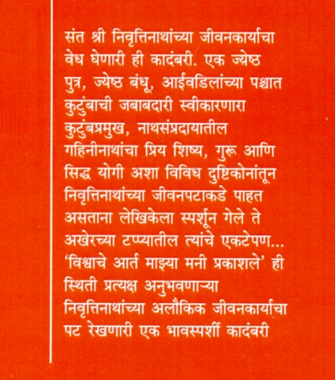 निवृत्ती, ज्ञानदेव, सोपान, मुक्ताबाई या चौघांच्याही जीवनाशी निगडित सर्व घटना याही कादंबरीत अपरिहार्यतेने येतात. निवृत्ती हे ज्ञानदेवांचे मोठे बंधू आणि गुरू, तसेच सोपान-मुक्ताईचेही मोठे बंधू. त्यामुळे या चौघांच्याही जीवनाशी निगडित सर्व घटना याही कादंबरीत अपरिहार्यतेने येतात; पण त्या घटनांकडे पाहण्याचा निवृत्तिनाथांचा दृष्टिकोन, भावंडांवर मायेची पाखर घालणं, ज्ञानदेवांचं गुरूपद स्वीकारणं इ. बाबींतून निवृत्तिनाथांच्या व्यक्तिमत्त्वाचे पैलू या कादंबरीतून उलगडत जातात. निवृत्ति-ज्ञानदेव-सोपान-मुक्ताबाई या चार अलौकिक मुलांना जन्म देणार्या विठ्ठलपंत आणि रुक्मिणीबाईंचे ज्येष्ठ अपत्य म्हणून निवृत्तिनाथांचा जन्म होणं आणि तीन भावंडांना सामधिस्थ होताना त्यांना पाहावं लागणं, नाथपंथाची दीक्षा घेऊनही विठ्ठलभक्ती आणि भागवत धर्माशीही त्यांनी स्वत:ला जोडून घेणं, हेच निवृत्तिनाथांच्या जीवनातील वेगळेपण ही कादंबरी अधोरेखित करते.