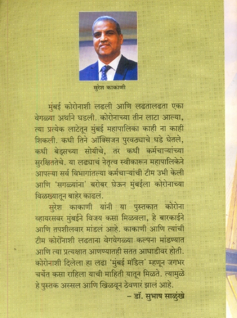 मुंबई कोरोनाशी लढली आणि लढतालढता एका वेगळ्या अर्थाने घडली. कोरोनाच्या तीन लाटा आल्या, त्या प्रत्येक लाटेतून मुंबई महापालिका काही ना काही शिकली. कधी तिने ऑक्सिजन पुरवठ्याचे धडे घेतले, कधी बेड्सच्या सोयीचे, तर कधी कर्मचाऱ्यांच्या सुरक्षिततेचे. या लढ्याचं नेतृत्व स्वीकारून महापालिकेने आपल्या सर्व विभागांतल्या कर्मचाऱ्यांची टीम उभी केली आणि ‌‘सगळ्यांना' बरोबर घेऊन मुंबईला कोरोनाच्या विळख्यातून बाहेर काढलं. सुरेश काकाणी यांनी या पुस्तकात कोरोना व्हायरसवर मुंबईने विजय कसा मिळवला, हे बारकाईने आणि तपशीलवार मांडलं आहे. काकाणी आणि त्यांची टीम कोरोनाशी लढताना वेगवेगळ्या कल्पना मांडण्यात आणि त्या प्रत्यक्षात आणण्यातही सतत आघाडीवर होती. कोरोनाशी दिलेला हा लढा ‌‘मुंबई मॉडेल' म्हणून जगभर चर्चेत कसा राहिला याची माहिती यातून मिळते. त्यामुळे हे पुस्तक अस्सल आणि खिळवून ठेवणारं झालं आहे. - डॉ. सुभाष साळुंखे