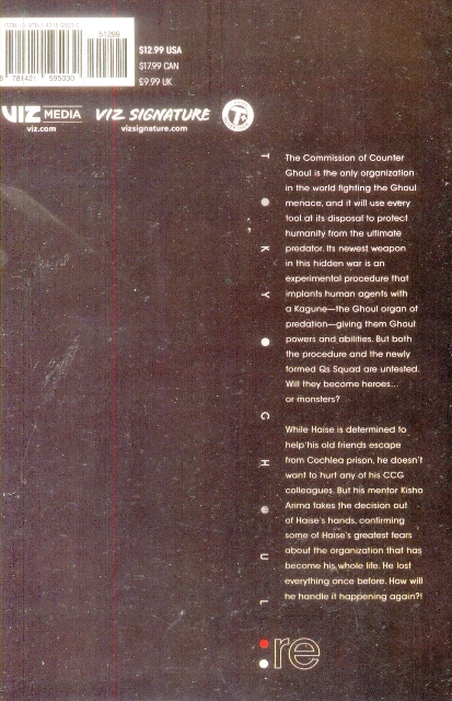 In the world of Tokyo Ghoul, sometimes the only way to fight monsters is to become one…The Commission of Counter Ghoul is the only organization fighting the Ghoul menace, and they will use every tool at their disposal to protect humanity from its ultimate predator. Their newest weapon in this hidden war is an experimental procedure that implants human investigators with a Ghoul’s Kagune, giving them Ghoul powers and abilities. But both the procedure and the newly formed Qs Squad are untested. Will they become heroes…or monsters?!While Haise is determined to help his old friends escape from Cochlea prison, he doesn’t want to hurt any of his CCG colleagues. But his mentor Kisho Arima takes the decision out of Haise’s hands, confirming some of Haise’s greatest fears about the organization that has become his whole life. He lost everything once before. How will he handle it happening again?!