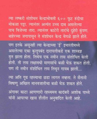 त्या लष्करी संशोधन केन्द्राभोवती 600 फूट रुंदीचा मोकळा पट्टा. त्यानंतर अत्यंत उच्च दाब असलेल्या पाच विजेच्या तारा. त्यानंतर काटेरी तारांचे दुहेरी कुंपण. बाहेरच्या जगापासून ते संशोधन केन्द्र वेगळे झाले होते. पण इतके असूनही त्या केन्द्राच्या `ई' इमारतीमध्ये असलेल्या एका कुलूपबंद दारापलीकडे एक शास्त्रज्ञ मृत झाला होता. तिथेच एक नवीन लस संशोधित केली होती. ती लस लक्षावधी माणसांचे बळी घेऊ शकत होती. पण ती नवीन संशोधित लस तिथून गायब झाली.... त्या अति गूढ रहस्याचा छडा लागत नव्हता. ते सौतानी विषाणू अखिल मानवजातीचा बळी घेऊ शकत होते. अंगावर काटा आणणारी रहस्यमय कादंबरी श्री. अशोक पाध्ये यांनी आपल्या खास शौलीत मराठीत अनुवादित केली आहे.