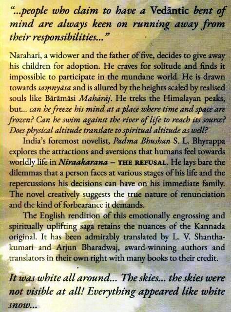 Narahari, a widower and the father of five, decides to give away his children for adoption. He craves for solitude and finds it impossible to participate in the mundane world. He is drawn towards saṃnyāsa and is allured by the heights scaled by realised souls like Bārāmāsi Mahārāj. He treks the Himalayan peaks, but… can he freeze his mind at a place where time and space are frozen? Can he swim against the river of life to reach its source? Does physical altitude translate to spiritual altitude as well? India’s foremost novelist, Padma Bhushan S. L. Bhyrappa explores the attractions and aversions that humans feel towards worldly life in Niraakarana – The Refusal. He lays bare the dilemmas that a person faces at various stages of his life and the repercussions his decisions can have on his immediate family. The novel creatively suggests the true nature of renunciation and the kind of forbearance it demands. The English rendition of this emotionally engrossing and spiritually uplifting saga retains the nuances of the Kannada original. It has been admirably translated by L. V. Shanthakumari and Arjun Bharadwaj, award-winning authors and translators in their own right with many books to their credit.