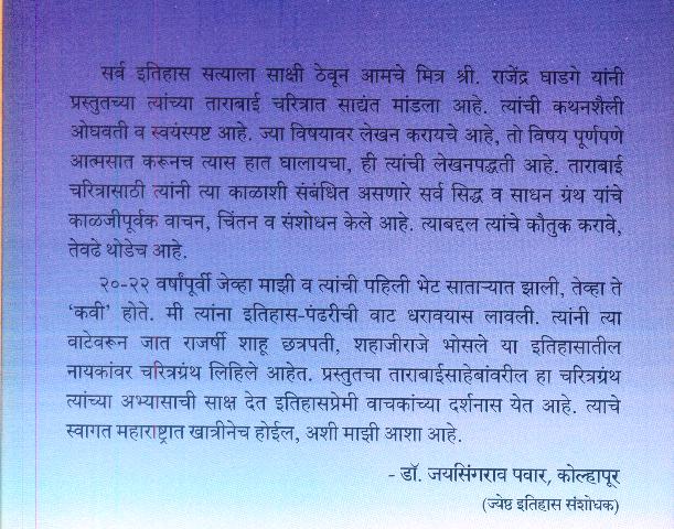 सर्व इतिहाथ सत्याला साक्षी ठेवून आमचे मित्र श्री. राजेंद्र घाडगे यांनी प्रस्तुतच्या त्यांच्या ताराबाई चरित्रात साधेत मांडला आहे. त्यांची कथनशैली ओघवती व स्वर्षस्पष्ट आहे. ज्या विषयावर लेखन करायचे आहे, तो विषय पूर्णपणे आत्मसात करूनच त्यास हात घालायचा, ही त्यांची लेखनपद्धती आहे, ताराबाई चरित्रासाठी त्यांनी त्या काळाशी संबंधित असणारे सर्व सिद्ध व साधन ग्रंथ यांचे काळजीपूर्वक वाचन, चिंतन व संशोधन केले आहे. त्याबद्दल त्यांचे कौतुक करावे, तेवढे थोडेच आहे. २०-२२ वर्षांपूर्वी जेव्हा माझी व त्यांची पहिली भेट साताऱ्यात झाली, तेव्हा ते 'कवी' होते. मी त्यांना इतिहास-पंढरीची वाट धरावयास लावली. त्यांनी त्या वाटेवरून जात राजर्षी शाहू छत्रपती, शहाजीराजे भोसले या इतिहासातील नायकांवर चरित्रग्रंथ लिहिले आहेत. प्रस्तुतचा ताराबाईसाहेबांवरील हा चरित्रग्रंथ त्यांच्या अभ्यासाची साक्ष देत इतिहासप्रेमी वाचकांच्या दर्शनास येत आहे. त्याचे स्वागत महाराष्ट्रात खात्रीनेच होईल, अशी माझी आशा आहे.
