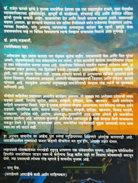डॉ. राजेश कापसे ह्यांचे हे पुस्तक नायजेरिया देशावर एक नवा प्रकाशझोत टाकते. एका वैद्यकीय व्यावसायिकाच्या दृष्टीकोनातून. ह्यापूर्वी मी मराठीमध्ये, शोभाताई बोंद्रे आणि शेतीतज्ञ धोंडेसर ह्यांची पुस्तके वाचली आहेत. काळाबरोबर देश आणि तिथले वास्तव बदलत असते. व्यवस्थाही बदलत असतात. ह्या सा-याचे यथातथ्य पण ललित शैलीमध्ये वर्णन राजेशच्या लिखाणात आहेच. त्याच्या मिश्कील, परंतु अभ्यासू स्वभावाचा प्रत्ययसुद्धा वारंवार येत रहातो. ह्यापुढे फक्त प्रवासवर्णनच नव्हे तर विविध विषयांवरचे त्याचे लिखाण वाचायला मिळावे अशा शुभेच्छा ! - डॉ. आनंद नाडकर्णी (मनोविकास तज्ञ)