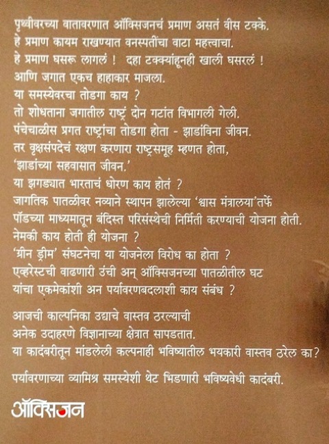पृथ्वीवरच्या वातावरणात ऑक्सिजनचं प्रमाण असतं वीस टक्के. हे प्रमाण कायम राखण्यात वनस्पतींचा वाटा महत्त्वाचा. हे प्रमाण घसरू लागलं ! दहा टक्क्यांहूनही खाली घसरलं ! आणि जगात एकच हाहाकार माजला. या समस्येवरचा तोडगा काय ? तो शोधताना जगातील राष्ट्र दोन गटांत विभागली गेली. पंचेचाळीस प्रगत राष्ट्रांचा तोडगा होता झाडांविना जीवन. तर वृक्षसंपदेचं रक्षण करणारा राष्ट्रसमूह म्हणत होता, 'झाडांच्या सहवासात जीवन.' या झगड्यात भारताचं धोरण काय होतं ? जागतिक पातळीवर नव्याने स्थापन झालेल्या 'श्वास मंत्रालया'तर्फे पॉडच्या माध्यमातून बंदिस्त परिसंस्थेची निर्मिती करण्याची योजन नेमकी काय होती ही योजना ? 'ग्रीन ड्रीम' संघटनेचा या योजनेला विरोध का होता ? एव्हरेस्टची वाढणारी उंची अन् ऑक्सिजनच्या पातळीतील घट यांचा एकमेकांशी,पर्यावरणबदलाशी काय संबंध ? आजची काल्पनिका उद्याचे वास्तव ठरल्याची अनेक उदाहरणे विज्ञानाच्या क्षेत्रात सापडतात. या कादंबरीतून मांडलेली कल्पनाही भविष्यातील भयकारी वास्तव ठरेल का ? पर्यावरणाच्या व्यामिश्र समस्येशी थेट भिडणारी भविष्यवेधी ही कादंबरी!