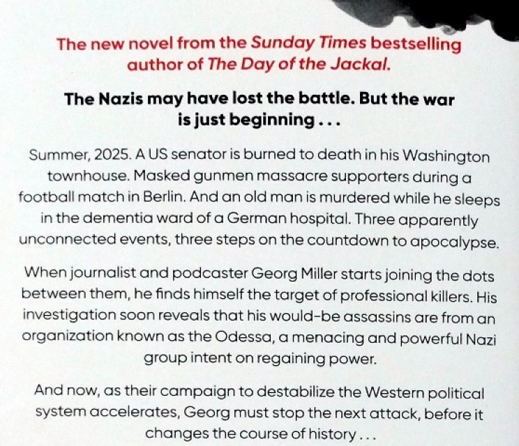 The bestselling author of The Day of the Jackal returns with his most explosive book yet. The Nazis may have lost the battle. But the war is just beginning... Summer, 2025. A US senator is burned to death in his Washington townhouse. Masked gunmen massacre supporters during a football match in Berlin. And an old man is murdered while he sleeps in the dementia ward of a German hospital. Three apparently unconnected events, three steps on the countdown to apocalypse. When journalist and podcaster Georg Miller starts joining the dots between them, he finds himself the target of professional killers. His investigation soon reveals that his would-be assassins are from an organisation known as the Odessa, a menacing and powerful Nazi group intent on regaining power. The Odessa has spread its poison from a covert compound in the Bavarian countryside all the way to the halls of the American Capitol. And now, as their campaign to destabilise the Western political system accelerates, Georg must stop the next attack, before it changes the course of history…