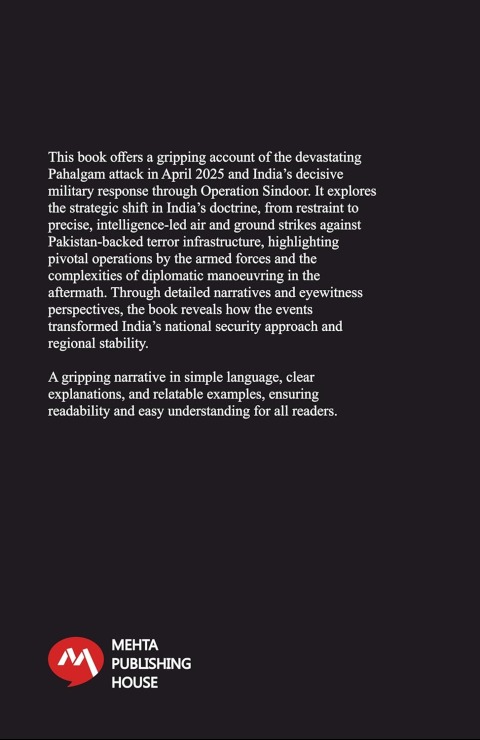 A GRIPPING ACCOUNT OF THE DEVASTATING PAHALGAM ATTACK IN APRIL 2025 AND INDIA’S DECISIVE MILITARY RESPONSE THROUGH OPERATION SINDOOR. IT EXPLORES THE STRATEGIC SHIFT IN INDIA’S DOCTRINE, FROM RESTRAINT TO PRECISE, INTELLIGENCE-LED AIR AND GROUND STRIKES AGAINST PAKISTAN-BACKED TERROR INFRASTRUCTURE, HIGHLIGHTING PIVOTAL OPERATIONS BY THE ARMED FORCES AND THE COMPLEXITIES OF DIPLOMATIC MANEUVERING IN THE AFTERMATH. THROUGH DETAILED NARRATIVES AND EYEWITNESS PERSPECTIVES, THE BOOK REVEALS HOW THE EVENTS TRANSFORMED INDIA’S NATIONAL SECURITY APPROACH AND REGIONAL STABILITY. A GRIPPING NARRATIVE IN SIMPLE LANGUAGE, CLEAR EXPLANATIONS, AND RELATABLE EXAMPLES, ENSURING READABILITY AND EASY UNDERSTANDING FOR ALL READERS."
