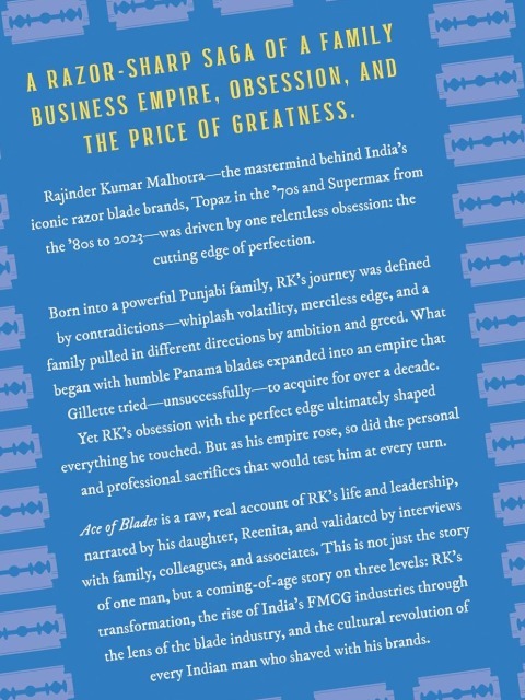 A Razor-Sharp Saga of a Family Business Empire, Obsession, and the Price of Greatness. Rajinder Kumar Malhotra—the mastermind behind India's iconic razor blade brands, Topaz in the '70s and Supermax from the '80s to 2023—was driven by one relentless obsession: the cutting edge of perfection. Born into a powerful Punjabi family, RK's journey was defined by contradictions—whiplash volatility, merciless edge, and a family pulled in different directions by ambition and greed. What began with humble Panama blades expanded into an empire that Gillette tried—unsuccessfully—to acquire for over a decade. Yet RK's obsession with the perfect edge ultimately shaped everything he touched. But as his empire rose, so did the personal and professional sacrifices that would test him at every turn. Ace of Blades is a raw, real account of RK's life and leadership, narrated by his daughter, Reenita, and validated by interviews with family, colleagues, and associates. This is not just the story of one man, but a coming-of-age story on three levels: RK's transformation, the rise of India's FMCG industries through the lens of the blade industry, and the cultural revolution of every Indian man who shaved with his brands.