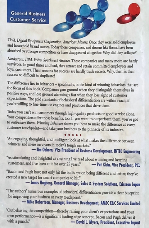"In an age where even the best products are quickly imitated, businesses must constantly find new ways to outpace competitors. Successful companies differentiate themselves not just with superior products, but also by how they behave toward their customers at every touchpoint: service, product development, marketing, branding, bids and proposals, presentations, negotiations, and more. Behavioral Differentiation is emerging as the ""final frontier"" in competitive strategy, and Winning Behavior shows how leading companies use it to exceed expectations and outperform competitors. This eye-opening book offers case histories and examples from companies like GE, Volvo, EMC, Ritz-Carlton, Wal-Mart, and Harley-Davidson, plus interviews with executives like George Zimmer (Men's Wearhouse), Colleen Barrett (Southwest Airlines), and Gerry Roche (Heidrick & Struggles). In todays ultracompetitive business landscape, product quality and competitive pricing are prerequisites for staying afloat. Winning Behavior reveals the secrets the best companies use -- and any business can use -- to stay at the pinnacle of success in their industry."