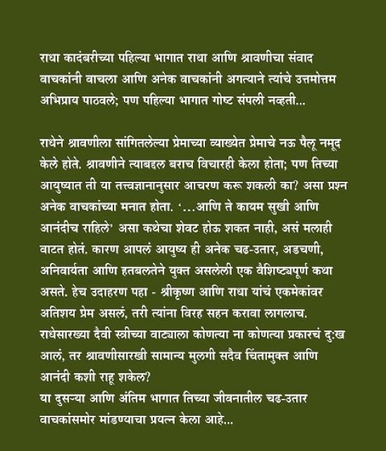 राधा कादंबरीच्या पहिल्या भागात राधा आणि श्रावणीचा संवाद वाचकांनी वाचला आणि अनेक वाचकांनी अगत्याने त्यांचे उत्तमोत्तम अभिप्राय पाठवले; पण पहिल्या भागात गोष्ट संपली नव्हती... राधेने श्रावणीला सांगितलेल्या प्रेमाच्या व्याख्येत प्रेमाचे नऊ पैलू नमूद केले होते. श्रावणीने त्याबद्दल बराच विचारही केला होता; पण तिच्या आयुष्यात ती या तत्त्वज्ञानानुसार आचरण करू शकली का? असा प्रश्न अनेक वाचकांच्या मनात होता. '... आणि ते कायम सुखी आणि आनंदीच राहिले' असा कथेचा शेवट होऊ शकत नाही, असं मलाही वाटत होतं. कारण आपलं आयुष्य ही अनेक चढ-उतार, अडचणी, अनिवार्यता आणि हतबलतेने युक्त असलेली एक वैशिष्ट्यपूर्ण कथा असते. हेच उदाहरण पहा : श्रीकृष्ण आणि राधा यांचं एकमेकांवर अतिशय प्रेम असलं, तरी त्यांना विरह सहन करावा लागलाच. राधेसारख्या दैवी स्त्रीच्या वाट्याला कोणत्या ना कोणत्या प्रकारचं दुःख आलं, तर श्रावणीसारखी सामान्य मुलगी सदैव चिंतामुक्त आणि आनंदी कशी राहू शकेल? या दुसऱ्या आणि अंतिम भागात तिच्या जीवनातील चढ-उतार वाचकांसमोर मांडण्याचा प्रयत्न केला आहे...