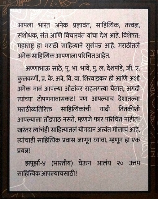 आपला भारत अनेक प्रज्ञावंत, साहित्यिक, तत्त्वज्ञ, संशोधक, संत आणि विचारवंत यांचा देश आहे. विशेषत: महाराष्ट्र हा मराठी साहित्याने सुसंपन्न आहे. मराठीतले अनेक साहित्यिक आपणाला परिचित आहेत. अण्णाभाऊ साठे, पू. भा. भावे, पु. ल. देशपांडे, जी. ए. कुलकर्णी, प्र. के. अत्रे, वि. वा. शिरवाडकर ही आणि अशी अनेक नावं आपल्या ओठांवर सहजगत्या येतात, अगदी त्यांच्या टोपणनावासकट! पण आपल्याच देशातल्या मराठीव्यतिरिक्त साहित्यिकांची यादी तितकीशी आपल्याला तोंडपाठ नसते, म्हणजे फार परिचित नाहीत! खरंतर त्यांचंही साहित्यातलं योगदान अत्यंत मोलाचं आहे. त्यांचाही साहित्यिक प्रवास जाणून घ्यावा, म्हणून हा एक प्रयत्न! झपूर्झा-४ (भारतीय) घेऊन आलंय २० उत्तम साहित्यिक आपल्याचसाठी!
