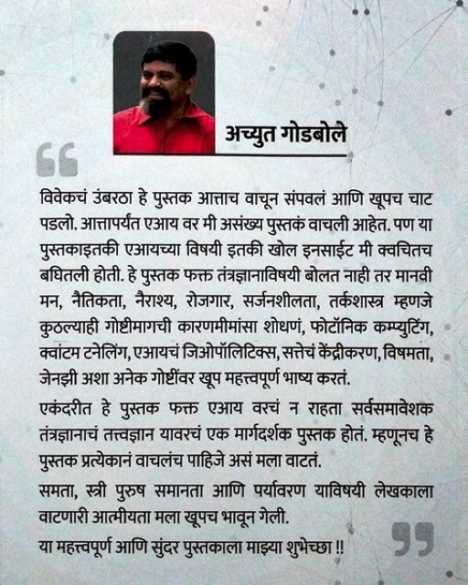या पुस्तकात एआयचे फक्त तांत्रिक स्पष्टीकरण नाही. भविष्य काय असणार आहे, ते का बदलत आहे आणि या बदलांचा व्यक्तिगत, सामाजिक, औद्योगिक आणि धोरणात्मक पातळीवर नेमका अर्थ काय आहे, याचे सखोल विश्लेषण या पुस्तकात जरूर आहे. जगाला दिशा देणारे एआयबाबतील तंत्रज्ञान, धोरण, सत्ता, राजकारण, संस्कृति, भू-राजकारण, कॉर्पोरेट, प्रशासन, अर्थकारण यांच्या विशाल परिघातून येणारे हे हार्वर्डच्या अभ्यासक-संशोधकाचे जागतिक चर्चा मराठीतून उपलब्ध करून देणारे थरारक पुस्तक! वाचा! डोळे आणि कान उघडे ठेवा. नाहीतर उद्या हेच 'एआय' तुमच्या छाताडावर बसून राज्य करेल आणि तुम्ही फक्त बघत बसाल!