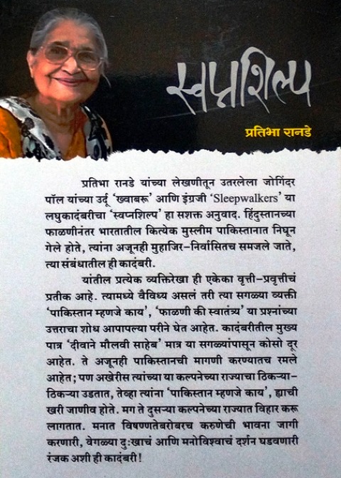 प्रतिभा रानडे यांच्या लेखणीतून उतरलेला जोगिंदर पॉल यांच्या उर्दू 'ख्वाबरू' आणि इंग्रजी 'Sleepwalkers' या लघुकादंबरीचा 'स्वप्नशिल्प' हा सशक्त अनुवाद. हिंदुस्तानच्या फाळणीनंतर भारतातील कित्येक मुस्लीम पाकिस्तानात निघून गेले होते, त्यांना अजूनही मुहाजिर-निर्वासितच समजले जाते, त्या संबंधातील ही कादंबरी. यांतील प्रत्येक व्यक्तिरेखा ही एकेका वृत्ती-प्रवृत्तीचं प्रतीक आहे. त्यामध्ये वैविध्य असलं तरी त्या सगळ्या व्यक्ती 'पाकिस्तान म्हणजे काय', 'फाळणी की स्वातंत्र्य' या प्रश्नांच्या उत्तराचा शोध आपापल्या परीने घेत आहेत. कादंबरीतील मुख्य पात्र 'दीवाने मौलवी साहेब' मात्र या सगळ्यांपासून कोसो दूर आहेत. ते अजूनही पाकिस्तानची मागणी करण्यातच रमले आहेत; पण अखेरीस त्यांच्या या कल्पनेच्या राज्याचा ठिकऱ्या- ठिकऱ्या उडतात, तेव्हा त्यांना 'पाकिस्तान म्हणजे काय', ह्याची खरी जाणीव होते. मग ते दुसऱ्या कल्पनेच्या राज्यात विहार करू लागतात. मनात विषण्णतेबरोबरच करुणेची भावना जागी करणारी, वेगळ्या दुःखाचं आणि मनोविश्वाचं दर्शन घडवणारी रंजक अशी ही कादंबरी !