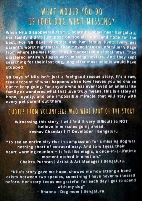 98 Days of Nila by Devakee Rahalkar is a true story that chronicles an extraordinary journey of love, resilience, and unwavering hope. When Nivedita’s beloved dog, Nila, runs away from a boarding facility near Bengaluru, it sparks a desperate 98-day-search across unfamiliar villages on the outskirts of Bengaluru – a search that does not stop until Nila is finally home. What begins as one family’s nightmare soon transforms into a powerful community movement. Over a thousand volunteers, connected through social media, join the mission to find Nila—searching through 25 kilometers of rural roads, dense fields, and endless uncertainty Heartfelt and deeply human, 98 Days of Nila celebrates the unbreakable bond between people and their pets, the kindness of strangers, and the magic that unfolds when an entire community comes together for a single act of love. More than a story about a lost dog, it’s a reminder that miracles are often made, not found.