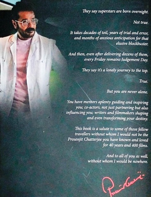 Prosenjit Chatterjee’s journey as one of Bengali cinema’s longest-reigning, most-commercially-viable superstars has been a remarkable and eventful one. Across his decades-spanning career, he has had the opportunity to work alongside luminaries of the filmmaking world. From sharing the screen with stalwarts like ‘Mahanayak’ Uttam Kumar, Soumitra Chatterjee and Sabitri Chatterjee, ruling mainstream Bengali films alongside fellow-superstar and partner-inpranks Tapas Paul, to gradually transitioning into a more artistically-inclined cinema under the deft direction of visionaries like Rituparno Ghosh, Buddhadeb Dasgupta and Goutam Ghose, he has—quite literally—done it all. Beyond the Spotlight is a voyage through Prosenjit Chatterjee’s memories. It gives readers a glimpse at the real people behind the shadows of stardom and myth, whose hard work and dedication translate into the magic we witness on-screen. Endearingly narrated by Prosenjit himself—and faithfully compiled by Roshmila Bhattacharya—this book is a must-read for his fans. BACK COVER TEXT They say superstars are born overnight. Not true. It takes decades of toil, years of trial and error, and months of anxious anticipation for that elusive blockbuster. And then, even after delivering dozens of them, every Friday remains Judgement Day. They say it’s a lonely journey to the top. True. But you are never alone. You have mentors aplenty guiding and inspiring you; co-actors, not just partnering, but also influencing you; writers and filmmakers shaping and even transforming your destiny. This book is a salute to some of those fellow travellers without whom I would not be the Prosenjit Chatterjee you have known and loved for 40 years and 400 films. And to all of you as well, without whom I would be nowhere.
