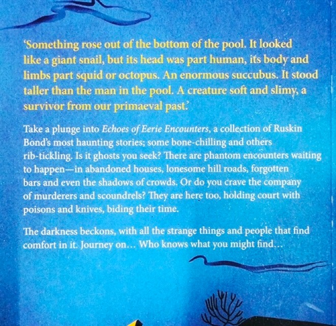 ‘Something rose out of the bottom of the pool. It looked like a giant snail, but its head was part human, its body and limbs part squid or octopus. An enormous succubus. It stood taller than the man in the pool. A creature soft and slimy, a survivor from our primaeval past.’ Take a plunge into Echoes of Eerie Encounters, a collection of Ruskin Bond’s most haunting stories; some bone-chilling and others rib-tickling. Is it ghosts you seek? There are phantom encounters waiting to happen—in abandoned houses, lonesome hill roads, forgotten bars and even the shadows of crowds. Or do you crave the company of murderers and scoundrels? They are here too, holding court with poisons and knives, biding their time. The darkness beckons, with all the strange things and people that find comfort in it. Journey on… Who knows what you might find…