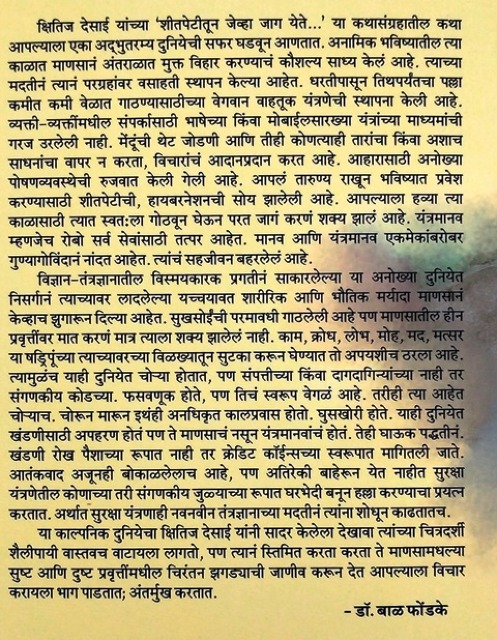 क्षितिज देसाई यांच्या 'शीतपेटीतून जेव्हा जाग येते...' या कथासंग्रहातील कथा आपल्याला एका अद्भुतरम्य दुनियेची सफर घडवून आणतात. अनामिक भविष्यातील त्या काळात माणसानं अंतराळात मुक्त विहार करण्याचं कौशल्य साध्य केलं आहे. त्याच्या मदतीनं त्यानं परग्रहांवर वसाहती स्थापन केल्या आहेत. धरतीपासून तिथपर्यंतचा पल्ला कमीत कमी वेळात गाठण्यासाठीच्या वेगवान वाहतूक यंत्रणेची स्थापना केली आहे. व्यक्ती-व्यक्तींमधील संपर्कासाठी भाषेच्या किंवा मोबाईलसारख्या यंत्रांच्या माध्यमांची गरज उरलेली नाही. मेंदूंची थेट जोडणी आणि तीही कोणत्याही तारांचा किंवा अशाच साधनांचा वापर न करता, विचारांचं आदानप्रदान करत आहे. आहारासाठी अनोख्या पोषणव्यवस्थेची रुजवात केली गेली आहे. आपलं तारुण्य राखून भविष्यात प्रवेश करण्यासाठी शीतपेटीची, हायबरनेशनची सोय झालेली आहे. आपल्याला हव्या त्या काळासाठी त्यात स्वत:ला गोठवून घेऊन परत जागं करणं शक्य झालं आहे. यंत्रमानव म्हणजेच रोबो सर्व सेवांसाठी तत्पर आहेत. मानव आणि यंत्रमानव एकमेकांबरोबर गुण्यागोविंदानं नांदत आहेत. त्यांचं सहजीवन बहरलेलं आहे. विज्ञान-तंत्रज्ञानातील विस्मयकारक प्रगतीनं साकारलेल्या या अनोख्या दुनियेत निसर्गानं त्याच्यावर लादलेल्या यच्चयावत शारीरिक आणि भौतिक मर्यादा माणसानं केव्हाच झुगारून दिल्या आहेत. सुखसोईंची परमावधी गाठलेली आहे पण माणसातील हीन प्रवृत्तींवर मात करणं मात्र त्याला शक्य झालेलं नाही. काम, क्रोध, लोभ, मोह, मद, मत्सर या षड्रिपूंच्या त्याच्यावरच्या विळख्यातून सुटका करून घेण्यात तो अपयशीच ठरला आहे. त्यामुळंच याही दुनियेत चोऱ्या होतात, पण संपत्तीच्या किंवा दागदागिन्यांच्या नाही तर संगणकीय कोडच्या. फसवणूक होते, पण तिचं स्वरूप वेगळं आहे. तरीही त्या आहेत चोऱ्याच. चोरून मारून इथंही अनधिकृत कालप्रवास होतो. घुसखोरी होते. याही दुनियेत खंडणीसाठी अपहरण होतं पण ते माणसाचं नसून यंत्रमानवांचं होतं. तेही घाऊक पद्धतीनं. खंडणी रोख पैशाच्या रूपात नाही तर क्रेडिट कॉईन्सच्या स्वरूपात मागितली जाते. आतंकवाद अजूनही बोकाळलेलाच आहे, पण अतिरेकी बाहेरून येत नाहीत सुरक्षा यंत्रणेतील कोणाच्या तरी संगणकीय जुळ्याच्या रूपात घरभेदी बनून हल्ला करण्याचा प्रयत्न करतात. अर्थात सुरक्षा यंत्रणाही नवनवीन तंत्रज्ञानाच्या मदतीनं त्यांना शोधून काढतातच.