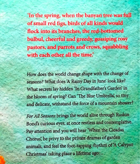 ‘In the spring, when the banyan tree was full of small red figs, birds of all kinds would flock into its branches, the red-bottomed bulbul, cheerful and greedy, gossiping rosy pastors, and parrots and crows, squabbling with each other all the time.’ How does the world change shape with the change of seasons? What does ‘A Rainy Day in June’ look like? What secrets lay hidden ‘In Grandfather’s Garden’ in the bloom of spring? Can ‘The Blue Umbrella’, so tiny and delicate, withstand the force of a mountain shower? For All Seasons brings the world alive through Ruskin Bond’s searching eyes, at once restless and contemplative. Pay attention and you will hear ‘When the Cicadas Chorus’, be privy to the private dramas of garden animals, and feel the foot-tapping rhythm of ‘A Calypso Christmas’ taking place a lifetime ago…