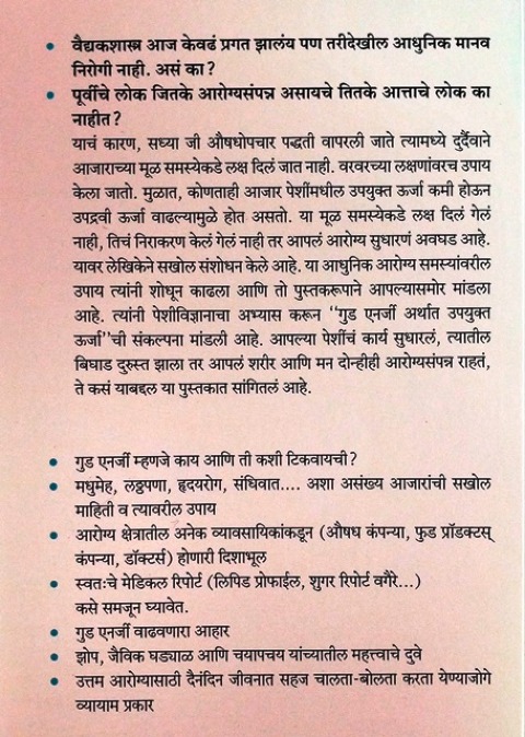 *वैद्यकशास्त्र आज केवढं प्रगत झालंय पण तरीदेखील आधुनिक मानव निरोगी नाही. असं का ? *पूर्वीचे लोक जितके आरोग्यसंपन्न असायचे तितके आत्ताचे लोक का नाहीत ? याचं कारण, सध्या जी औषधोपचार पद्धती वापरली जाते त्यामध्ये दुर्दैवाने आजाराच्या मूळ समस्येकडे लक्ष दिलं जात नाही. वरवरच्या लक्षणांवरच उपाय केला जातो. मुळात, कोणताही आजार पेशींमधील उपयुक्त ऊर्जा कमी होऊन उपद्रवी ऊर्जा वाढल्यामुळे होत असतो. या मूळ समस्येकडे लक्ष दिलं गेलं नाही, तिचं निराकरण केलं गेलं नाही तर आपलं आरोग्य सुधारणं अवघड आहे. यावर लेखिकेने सखोल संशोधन केले आहे. या आधुनिक आरोग्य समस्यांवरील उपाय त्यांनी शोधून काढला आणि तो पुस्तकरूपाने आपल्यासमोर मांडला आहे. त्यांनी पेशीविज्ञानाचा अभ्यास करून "गुड एनर्जी अर्थात उपयुक्त ऊर्जा"ची संकल्पना मांडली आहे. आपल्या पेशींचं कार्य सुधारलं, त्यातील बिघाड दुरुस्त झाला तर आपलं शरीर आणि मन दोन्हीही आरोग्यसंपन्न राहतं, ते कसं याबद्दल या पुस्तकात सांगितलं आहे. *गुड एनर्जी म्हणजे काय आणि ती कशी टिकवायची ? *मधुमेह, लठ्ठपणा, हृदयरोग, संधिवात.... अशा असंख्य आजारांची सखोल माहिती व त्यावरील उपाय *आरोग्य क्षेत्रातील अनेक व्यावसायिकांकडून (औषध कंपन्या, फुड प्रॉडक्टस् कंपन्या, डॉक्टर्स) होणारी दिशाभूल *स्वतःचे मेडिकल रिपोर्ट (लिपिड प्रोफाईल, शुगर रिपोर्ट वगैरे...) कसे समजून घ्यावेत. *गुड एनर्जी वाढवणारा आहार *झोप, जैविक घड्याळ आणि चयापचय यांच्यातील महत्त्वाचे दुवे *उत्तम आरोग्यासाठी दैनंदिन जीवनात सहज चालता-बोलता करता येण्याजोगे व्यायाम प्रकार