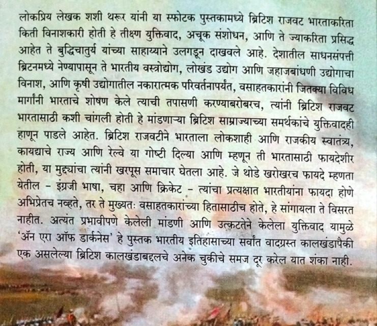 लोकप्रिय लेखक शशी थरूर यांनी या स्फोटक पुस्तकामध्ये ब्रिटिश राजवट भारताकरिता किती विनाशकारी होती हे तीक्ष्ण युक्तिवाद, अचूक संशोधन, आणि ते ज्याकरिता प्रसिद्ध आहेत ते बुद्धिचातुर्य यांच्या साहाय्याने उलगडून दाखवले आहे. देशातील साधनसंपत्ती ब्रिटनमध्ये नेण्यापासून ते भारतीय वस्त्रोद्योग, लोखंड उद्योग आणि जहाजबांधणी उद्योगाचा विनाश, आणि कृषी उद्योगातील नकारात्मक परिवर्तनापर्यंत, वसाहतकारांनी जितक्या विविध मार्गांनी भारताचे शोषण केले त्याची तपासणी करण्याबरोबरच, त्यांनी ब्रिटिश राजवट भारतासाठी कशी चांगली होती हे मांडणाऱ्या ब्रिटिश साम्राज्याच्या समर्थकांचे युक्तिवादही हाणून पाडले आहेत. ब्रिटिश राजवटीने भारताला लोकशाही आणि राजकीय स्वातंत्र्य, कायद्याचे राज्य आणि रेल्वे या गोष्टी दिल्या आणि म्हणून ती भारतासाठी फायदेशीर होती, या मुद्द्यांचा त्यांनी खरपूस समाचार घेतला आहे. जे थोडे खरोखरच फायदे म्हणता येतील इंग्रजी भाषा, चहा आणि क्रिकेट त्यांचा प्रत्यक्षात भारतीयांना फायदा होणे अभिप्रेतच नव्हते, तर ते मुख्यतः वसाहतकारांच्या हितासाठीच होते, हे सांगायला ते विसरत नाहीत. अत्यंत प्रभावीपणे केलेली मांडणी आणि उत्कटतेने केलेला युक्तिवाद यामुळे ‘अॅन एरा ऑफ डार्कनेस’ हे पुस्तक भारतीय इतिहासाच्या सर्वांत वादग्रस्त कालखंडापैकी एक असलेल्या ब्रिटिश कालखंडाबद्दलचे अनेक चुकीचे समज दूर करेल यात शंका नाही.