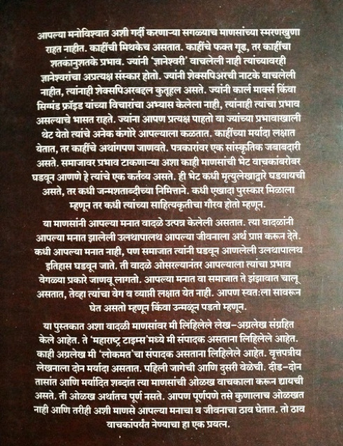 आपल्या मनोविश्वात अशी गर्दी करणाऱ्या सगळ्याच माणसांच्या स्मरणखुणा राहत नाहीत. काहींची मिथकेच असतात. काहींचे फक्त गूढ, तर काहींचा शतकानुशतके प्रभाव. ज्यांनी ‘ज्ञानेश्वरी’ वाचलेली नाही त्यांच्यावरही ज्ञानेश्वरांचा अप्रत्यक्ष संस्कार होतो. ज्यांनी शेक्सपिअरची नाटके वाचलेली नाहीत, त्यांनाही शेक्सपिअरबद्दल कुतूहल असते. ज्यांनी कार्ल मार्क्स किंवा सिग्मंड फ्रॉइड यांच्या विचारांचा अभ्यास केलेला नाही, त्यांनाही त्यांचा प्रभाव असल्याचे भासत राहते. ज्यांना आपण प्रत्यक्ष पाहतो वा ज्यांच्या प्रभावाखाली थेट येतो त्यांचे अनेक कंगोरे आपल्याला कळतात. काहींच्या मर्यादा लक्षात येतात, तर काहींचे अथांगपण जाणवते. पत्रकारांवर एक सांस्कृतिक जबाबदारी असते. समाजावर प्रभाव टाकणाऱ्या अशा काही माणसांची भेट वाचकांबरोबर घडवून आणणे हे त्यांचे एक कर्तव्य असते. ही भेट कधी मृत्युलेखाद्वारे घडवायची असते, तर कधी जन्मशताब्दीच्या निमित्ताने. कधी एखादा पुरस्कार मिळाला म्हणून तर कधी त्यांच्या साहित्यकृतीचा गौरव होतो म्हणून. या माणसांनी आपल्या मनात वादळे उत्पन्न केलेली असतात. त्या वादळांनी आपल्या मनात झालेली उलथापालथ आपल्या जीवनाला अर्थ प्राप्त करून देते. कधी आपल्या मनात नाही, पण समाजात त्यांनी घडवून आणलेली उलथापालथ इतिहास घडवून जाते. ती वादळे ओसरल्यानंतर आपल्याला त्यांचा प्रभाव वेगळ्या प्रकारे जाणवू लागतो. आपल्या मनात वा समाजात ते झंझावात चालू असतात, तेव्हा त्यांचा वेग व व्याप्ती लक्षात येत नाही. आपण स्वतःला सावरून घेत असतो म्हणून किंवा उन्मळून पडतो म्हणून. या पुस्तकात अशा वादळी माणसांवर मी लिहिलेले लेख-अग्रलेख संग्रहित केले आहेत. ते ‘महाराष्ट्र टाइम्स’मध्ये मी संपादक असताना लिहिलेले आहेत. काही अग्रलेख मी ‘लोकमत’चा संपादक असताना लिहिलेले आहेत. वृत्तपत्रीय लेखनाला दोन मर्यादा असतात. पहिली जागेची आणि दुसरी वेळेची. दीड-दोन तासांत आणि मर्यादित शब्दांत त्या माणसांची ओळख वाचकाला करून द्यायची असते. ती ओळख अर्थातच पूर्ण नसते. आपण पूर्णपणे तसे कुणालाच ओळखत नाही आणि तरीही अशी माणसे आपल्या मनाचा व जीवनाचा ठाव घेतात. तो ठाव वाचकांपर्यंत नेण्याचा हा एक प्रयत्न.