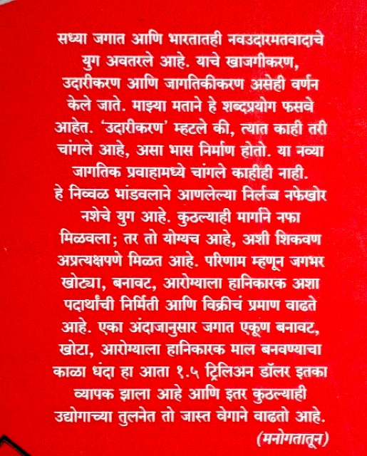 सध्या जगात आणि भारतातही नवउदारमतवादाचे युग अवतरले आहे. याचे खाजगीकरण, उदारीकरण आणि जागतिकीकरण असेही वर्णन केले जाते. माझ्या मताने हे शब्दप्रयोग फसवे आहेत. ‘उदारीकरण’ म्हटले की, त्यात काही तरी चांगले आहे, असा भास निर्माण होतो. या नव्या जागतिक प्रवाहामध्ये चांगले काहीही नाही. हे निव्वळ भांडवलाने आणलेल्या निर्लज्ज नफेखोर नशेचे युग आहे. कुठल्याही मार्गाने नफा मिळवला; तर तो योग्यच आहे, अशी शिकवण अप्रत्यक्षपणे मिळत आहे. परिणाम म्हणून जगभर खोट्या, बनावट, आरोग्याला हानिकारक अशा पदार्थांची निर्मिती आणि विक्रीचं प्रमाण वाढते आहे. एका अंदाजानुसार जगात एकूण बनावट, खोटा, आरोग्याला हानिकारक माल बनवण्याचा काळा धंदा हा आता १.५ ट्रिलिअन डॉलर इतका व्यापक झाला आहे आणि इतर कुठल्याही उद्योगाच्या तुलनेत तो जास्त वेगाने वाढतो आहे.