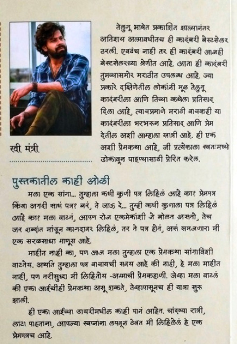 तेलुगू भाषेत प्रकाशित झाल्यानंतर अतिशय अल्पावधीत ही कादंबरी बेस्टसेलर ठरली , एवढंच नाही तर ही कादंबरी आजही बेस्ट सेलर च्या श्रेणीत आहे. आता ही कादंबरी तुमच्यासमोर मराठीत उपलब्ध आहे. ज्या प्रकारे दक्षिणेतील लोकांनी मूळ तेलुगू कादंबरीला आणि तिच्या कथेला प्रतिसाद दिला आहे, त्याचप्रमाणे मराठी वाचकही या कादंबरीला भरभरून प्रतिसाद आणि प्रेम देतील अशी आम्हाला खात्री आहे. ही एक अशी प्रेमकथा आहे, जी प्रत्येकाला स्वतःमध्ये डोकावून पाहण्यासाठी प्रेरित करेल. पुस्तकातील काही ओळी मला एक सांगा... तुम्हाला कधी कुणी पत्र लिहिलं आहे का? प्रेमपत्र किंवा अगदी साधं पत्र? बरं, ते जाऊ दे... तुम्ही कधी कुणाला पत्र लिहिलं आहे का? मला वाटतं, आपण रोज एकमेकांशी जे बोलत असतो, तेच जर शब्दांत मांडून कागदावर लिहिलं, तर ते पत्र होतं, असं समजणारा मी एक सरळसाधा माणूस आहे. माहीत नाही का, पण आज मला तुम्हाला एक प्रेमकथा सांगाविशी वाटतेय, अर्थात तुम्हाला पत्र वाचायची सवय आहे की नाही, हे मला माहीत नाही, पण तरीसुध्दा मी लिहितोय अम्माची प्रेमकहाणी. जेव्हा मला वाटलं की एका आईचीही प्रेमकथा असू शकते, तेव्हापासूनच ही यात्रा सुरु झाली. ही एका आईच्या डायरीमधील काही पानं आहेत. चांदण्या रात्री, लाटा पाहताना, आपल्या स्वप्नांना लपवून ठेवत मी लिहिलेलं हे एक प्रेमपत्रच आहे