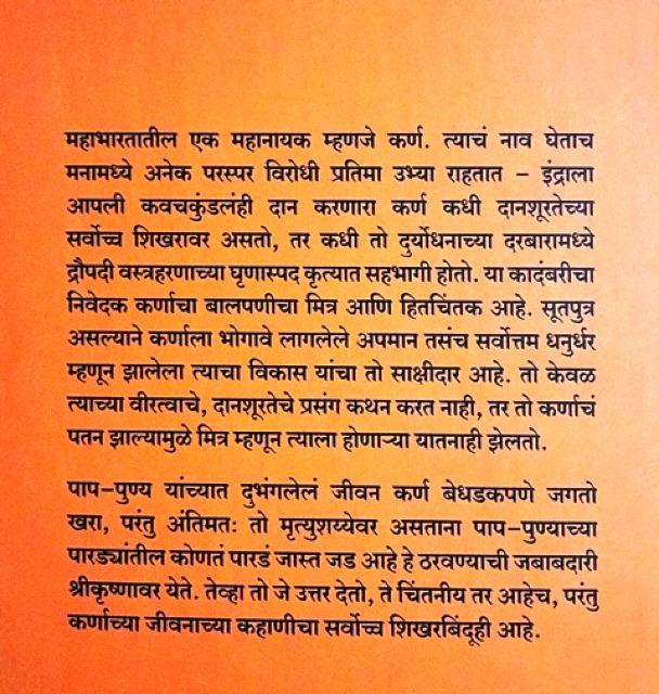 महाभारतातील एक महानायक म्हणजे कर्ण. त्याचं नाव घेताच मनामध्ये अनेक परस्पर विरोधी प्रतिमा उभ्या राहतात – इंद्राला आपली कवचकुंडलंही दान करणारा कर्ण कधी दानशूरतेच्या सर्वोच्च शिखरावर असतो, तर कधी तो दुर्योधनाच्या दरबारामध्ये द्रौपदी वस्त्रहरणाच्या घृणास्पद कृत्यात सहभागी होतो. या कादंबरीचा निवेदक कर्णाचा बालपणीचा मित्र आणि हितचिंतक आहे. सूतपुत्र असल्याने कर्णाला भोगावे लागलेले अपमान तसंच सर्वोत्तम धनुर्धर म्हणून झालेला त्याचा विकास यांचा तो साक्षीदार आहे. तो केवळ त्याच्या वीरत्वाचे, दानशूरतेचे प्रसंग कथन करत नाही, तर तो कर्णाचं पतन झाल्यामुळे मित्र म्हणून त्याला होणाऱ्या यातनाही झेलतो. पाप-पुण्य यांच्यात दुभंगलेलं जीवन कर्ण बेधडकपणे जगतो खरा, परंतु अंतिमतः तो मृत्युशय्येवर असताना पाप-पुण्याच्या पारड्यांतील कोणतं पारडं जास्त जड आहे हे ठरवण्याची जबाबदारी श्रीकृष्णावर येते. तेव्हा तो जे उत्तर देतो, ते चिंतनीय तर आहेच, परंतु कर्णाच्या जीवनाच्या कहाणीचा सर्वोच्च शिखरबिंदूही आहे.