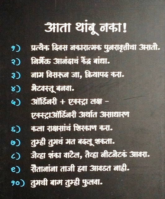 आता थांबू नका ! १) प्रत्येक दिवस नकारात्मक पुनरावृत्तीचा असतो. २) निर्भेळ आनंदाचं केंद्र बांधा. ३) नाम विसरून जा, क्रियापद करा. ४) भेटवस्तू बनवा. ५) ऑर्डिनरी + एक्स्ट्रा लक्ष -एक्स्ट्राऑर्डिनरी अर्थात असाधारण ६) कला राक्षसांचं शिरकाण करा. ७) तुम्ही तुमचं मत बदलू शकता. ८) जेव्हा शंका वाटेल, तेव्हा नीटनेटकं आवरा. ९ ) सैतानांना ताजी हवा आवडत नाही. १०) तुमची बाग तुम्ही फुलवा.