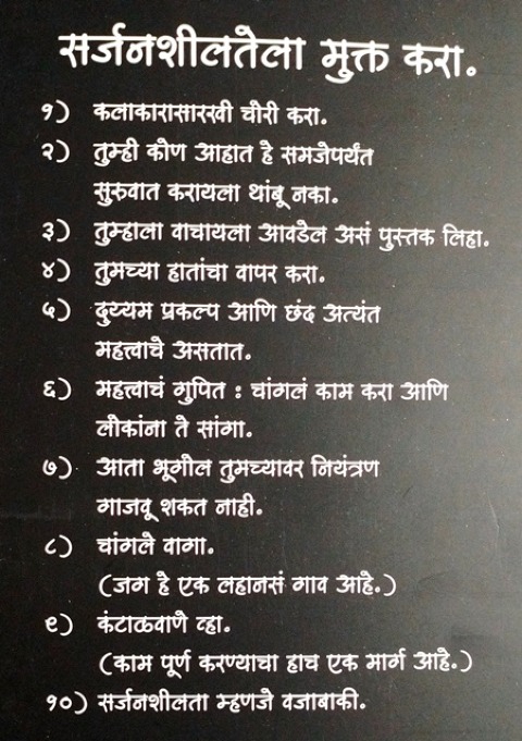 सर्जनशीलतेला मुक्त करा. १) कलाकारासारखी चोरी करा. २) तुम्ही कोण आहात है समजेपर्यंत सुरुवात करायला थांबू नका. ३) तुम्हाला वाचायला आवडेल असं पुस्तक लिहा. ४) तुमच्या हातांचा वापर करा. ५) दुय्यम प्रकल्प आणि छंद अत्यंत महत्त्वाचे असतात. ६) महत्त्वाचं गुपित : चांगलं काम करा आणि लौकांना ते सांगा. ७) आता भूगोल तुमच्यावर नियंत्रण गाजवू शकत नाही. ८) चांगले वागा. (जग है एक लहानसं गाव आहे.) ९) कंटाळवाणे व्हा. (काम पूर्ण करण्याचा हाच एक मार्ग आहे. १०) सर्जनशीलता म्हणजे वजाबाकी.