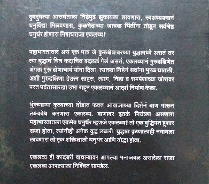 दुमदुमत्या आसमंताला निठेपुढं झुकायला लावणारा, स्वअध्ययनान धनुर्विद्या मिळवणारा, कुळभेदाच्या जाचक भिंतींना तोडून सर्वश्रेष्ठ धनुर्धर होणारा निषाधराजा एकलव्य ! महाभारतातलं असं एक पात्र जे कुरुक्षेत्रावरच्या युद्धामध्ये असतं तर त्या युद्धाचं चित्र कदाचित बदललं गेलं असतं. एकलव्यानं गुरुदक्षिणेत अंगठा गुरू द्रोणाचार्य यांना दिला, त्याच्या निष्ठेनं सर्वांना भुरळ घातली. अशी गुरुदक्षिणा देऊन साहस, त्याग, निष्ठा व समर्पणाच्या जोरावर परत पर्वतासारखा उभा राहून एकलव्यानं आदर्श निर्माण केला. भुंकणाऱ्या कुत्र्याच्या तोंडात फक्त आवाजाच्या दिशेनं बाण मारून लक्ष्यवेध करणारा एकलव्य बाणावर इतकं नियंत्रण असणारा महाभारतातला एकमेव धनुर्धर म्हणजे एकलव्य! तो एक बुद्धिमंत हुशार राजा होता, त्यांनीही अनेक युद्ध लढली. युद्धात कृष्णालाही नमायला लावणारा तो एक शक्तिशाली धनुर्धर आणि योद्धा होता. एकलव्य ही कादंबरी वाचल्यावर आपल्या मनाजवळ असलेला राजा. एकलव्य आपल्याला निश्चित सापडेल.