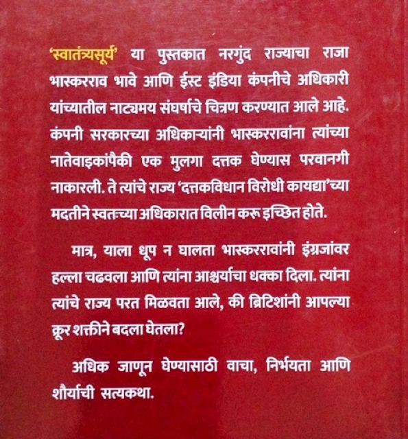 'स्वातंत्र्यसूर्य' या पुस्तकात नरगुंद राज्याचा राजा भास्करराव भावे आणि ईस्ट इंडिया कंपनीचे अधिकारी यांच्यातील नाट्यमय संघर्षाचे चित्रण करण्यात आले आहे. कंपनी सरकारच्या अधिकाऱ्यांनी भास्कररावांना त्यांच्या नातेवाइकांपैकी एक मुलगा दत्तक घेण्यास परवानगी नाकारली. ते त्यांचे राज्य 'दत्तकविधान विरोधी कायद्या'च्या मदतीने स्वतःच्या अधिकारात विलीन करू इच्छित होते. मात्र, याला धूप न घालता भास्कररावांनी इंग्रजांवर हल्ला चढवला आणि त्यांना आश्चर्याचा धक्का दिला. त्यांना त्यांचे राज्य परत मिळवता आले, की ब्रिटिशांनी आपल्या क्रूर शक्तीने बदला घेतला? अधिक जाणून घेण्यासाठी वाचा, निर्भयता आणि शौर्याची सत्यकथा.