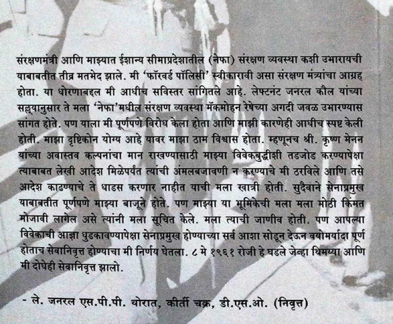 " गेल्या शतकात कोल्हापूर संस्थानातील शेतकरी कुटुंबातील एक मुलगा हिंदी लष्करातील सर्वोच्च अधिकारपदावर जातो, ही काही आपोआप सहजगत्या घडून आलेली घटना नसून तिला एक ऐतिहासिक व सामाजिक कारणपरंपरा होती आणि त्या परंपरेचा उद्गम बिंदू होता कोल्हापूरचा लोकराजा रावर्षी शाहू छत्रपती. त्यांच्या राजाश्रयाने वडगावच्या चिमणाजी पाटलांचा मुलगा, पांडुरंग, हा उच्चविद्याविभूषित झाला आणि भारतातील थोर कृषितज्ज्ञ म्हणून रावब. डॉ.पी.सी.पाटील या नावाने प्रसिद्धी पावला! या रावबहादुरांचे चिरंजीव शंकरराव म्हणजे प्रस्तुत चरित्र नायक ले.ज.एस.पी.पी.थोरात. हे सर्व इथं आठवले एवढ्यासाठी की सन १८९९ मध्ये शाहू छत्रपतींनी पांडुरंग पाटील नावाचा मुलगा मॅट्रिक पास झाल्याचे कळाल्यानंतर त्याच्या गावी खास घोडेस्वार पाठवून त्याला बोलावून घेतले नसते व पुढील शिक्षणासाठी प्रवृत्त केले नसते तर 'रावबहादूर डॉ.पी.सी. पाटील'च नव्हे तर जनरल एस.पी.पी. थोरातही देशाला मिळाले नसते. अशा ऐतिहासिक व सामाजिक घटनांची कारणपरंपरा इतिहास आपणास सांगत असतो. इतिहासाची खरी फलश्रुती हीच आहे." " गेल्या शतकात कोल्हापूर संस्थानातील शेतकरी कुटुंबातील एक मुलगा हिंदी लष्करातील सर्वोच्च अधिकारपदावर जातो, ही काही आपोआप सहजगत्या घडून आलेली घटना नसून तिला एक ऐतिहासिक व सामाजिक कारणपरंपरा होती आणि त्या परंपरेचा उद्गम बिंदू होता कोल्हापूरचा लोकराजा रावर्षी शाहू छत्रपती. त्यांच्या राजाश्रयाने वडगावच्या चिमणाजी पाटलांचा मुलगा, पांडुरंग, हा उच्चविद्याविभूषित झाला आणि भारतातील थोर कृषितज्ज्ञ म्हणून रावब. डॉ.पी.सी.पाटील या नावाने प्रसिद्धी पावला! या रावबहादुरांचे चिरंजीव शंकरराव म्हणजे प्रस्तुत चरित्र नायक ले.ज.एस.पी.पी.थोरात. हे सर्व इथं आठवले एवढ्यासाठी की सन १८९९ मध्ये शाहू छत्रपतींनी पांडुरंग पाटील नावाचा मुलगा मॅट्रिक पास झाल्याचे कळाल्यानंतर त्याच्या गावी खास घोडेस्वार पाठवून त्याला बोलावून घेतले नसते व पुढील शिक्षणासाठी प्रवृत्त केले नसते तर 'रावबहादूर डॉ.पी.सी. पाटील'च नव्हे तर जनरल एस.पी.पी. थोरातही देशाला मिळाले नसते. अशा ऐतिहासिक व सामाजिक घटनांची कारणपरंपरा इतिहास आपणास सांगत असतो. इतिहासाची खरी फलश्रुती हीच आहे."
