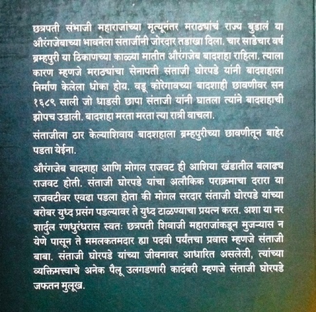 छत्रपती संभाजी महाराजांच्या मृत्यूनंतर मराठ्यांचं राज्य बुडालं या औरंगजेबाच्या भावनेला संताजींनी जोरदार तडाखा दिला. चार साडेचार वर्ष ब्रम्हपुरी या ठिकाणच्या काळ्या मातीत औरंगजेब बादशहा राहिला. त्याला कारण म्हणजे मराठ्यांचा सेनापती संताजी घोरपडे यांनी बादशहाला निर्माण केलेला धोका होय. वडू कोरेगावच्या बादशाही छावणीवर सन १६८९ साली जो धाडसी छापा संताजी यांनी घातला त्यांने बादशहाची झोपच उडाली, बादशहा मरता मरता त्या रात्री वाचला. संताजीला ठार केल्याशिवाय बादशहाला ब्रम्हपुरीच्या छावणीतून बाहेर पडता येईना. औरंगजेब बादशहा आणि मोगल राजवट ही आशिया खंडातील बलाढ्य राजवट होती. संताजी घोरपडे यांचा अलौकिक पराक्रमाचा दरारा या राजवटीवर एवढा पडला होता की मोगल सरदार संताजी घोरपडे यांच्या बरोबर युध्द प्रसंग पडल्यावर ते युध्द टाळण्याचा प्रयत्न करत. अशा या नर शार्दुल रणधुरंधरास स्वतः छत्रपती शिवाजी महाराजांकडून मुजऱ्यास न येणे पासून ते ममलकतमदार ह्या पदवी पर्यंतचा प्रवास म्हणजे संताजी बाबा. संताजी घोरपडे यांच्या जीवनावर आधारित असलेली, त्यांच्या व्यक्तिमत्त्वाचे अनेक पैलू उलगडणारी कादंबरी म्हणजे संताजी घोरपडे जफतन मुलूख.
