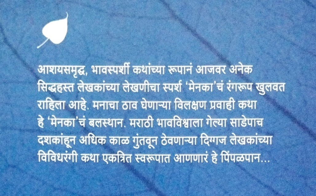 आशयसमृद्ध, भावस्पर्शी कथांच्या रूपानं आजवर अनेक सिद्धहस्त लेखकांच्या लेखणीचा स्पर्श 'मेनका'चं रंगरूप खुलवत राहिला आहे. मनाचा ठाव घेणाऱ्या विलक्षण प्रवाही कथा हे 'मेनका'चं बलस्थान. मराठी भावविश्वाला गेल्या साडेपाच दशकांहून अधिक काळ गुंतवून ठेवणाऱ्या दिग्गज लेखकांच्या विविधरंगी कथा एकत्रित स्वरूपात आणणारं हे पिंपळपान...